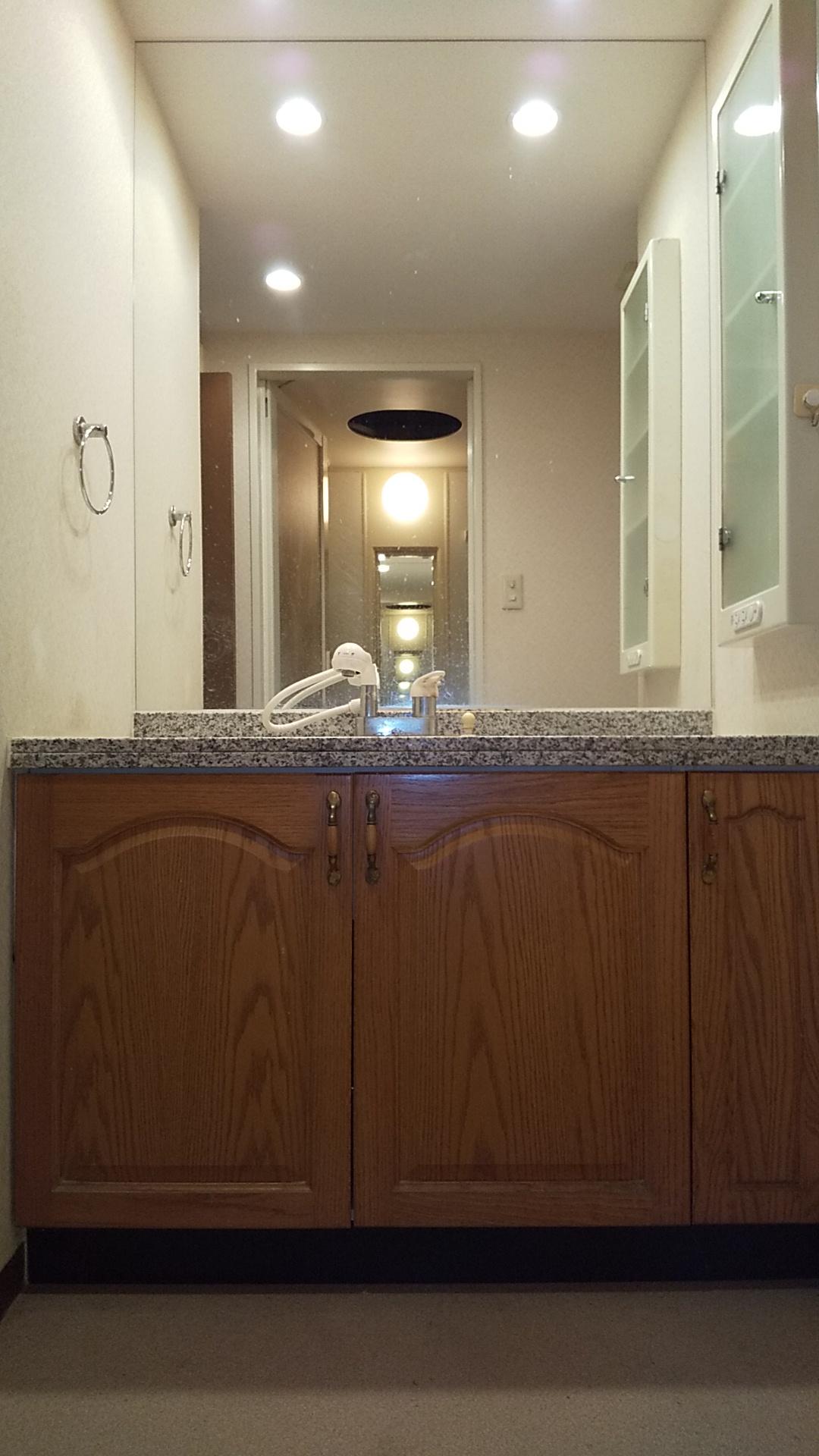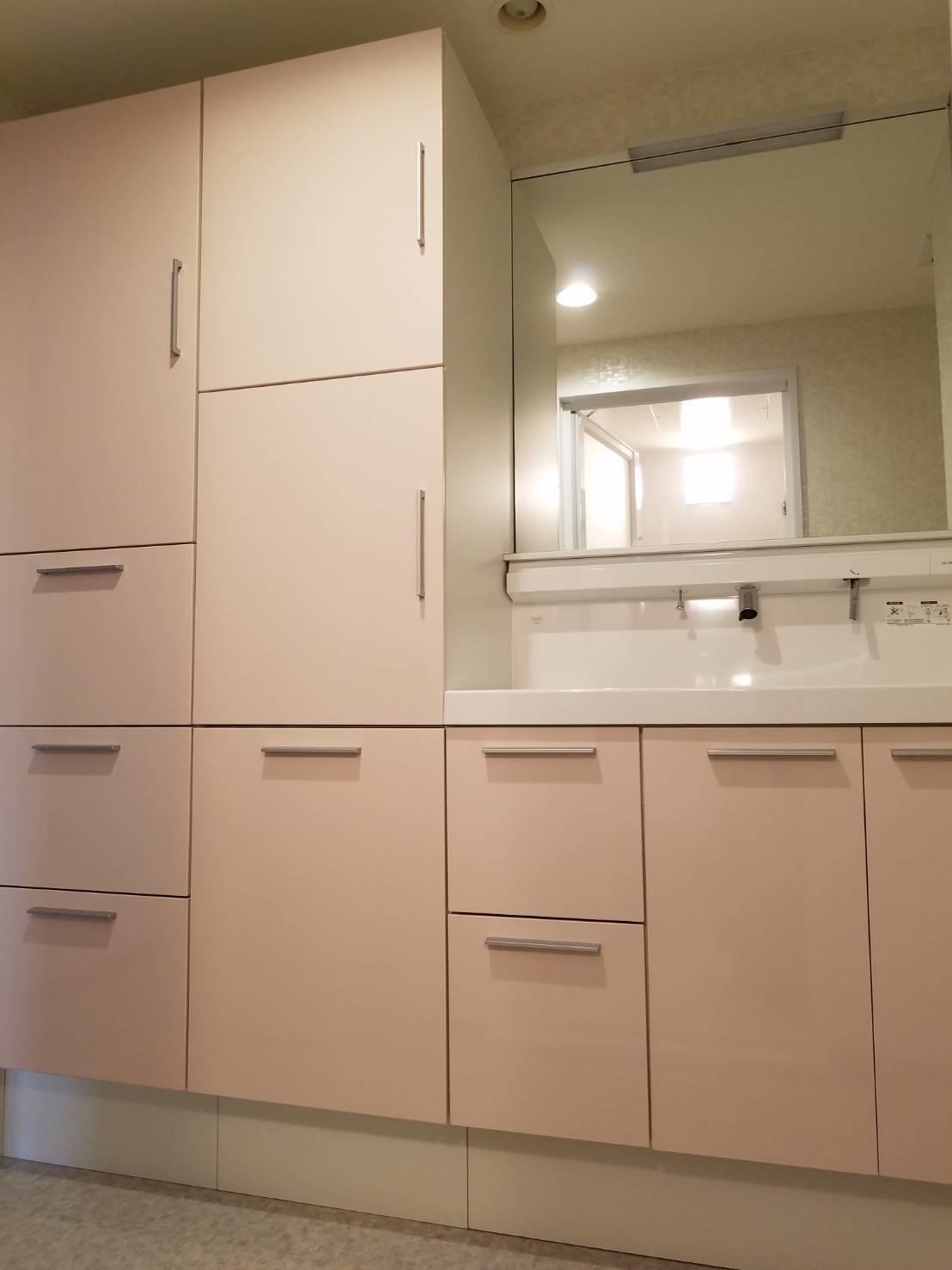 造作の洗面台と収納棚を一体型システム洗面化粧台に