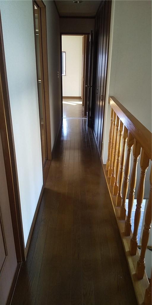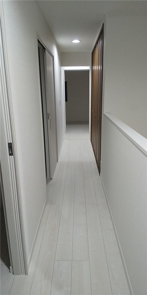 白い壁と床の一体感で広さと明るさを感じさせる廊下に