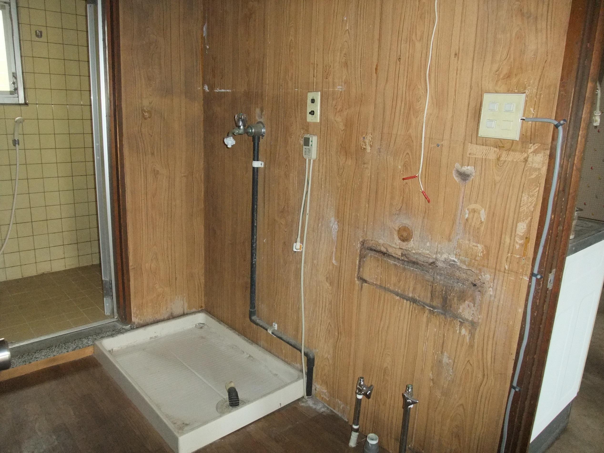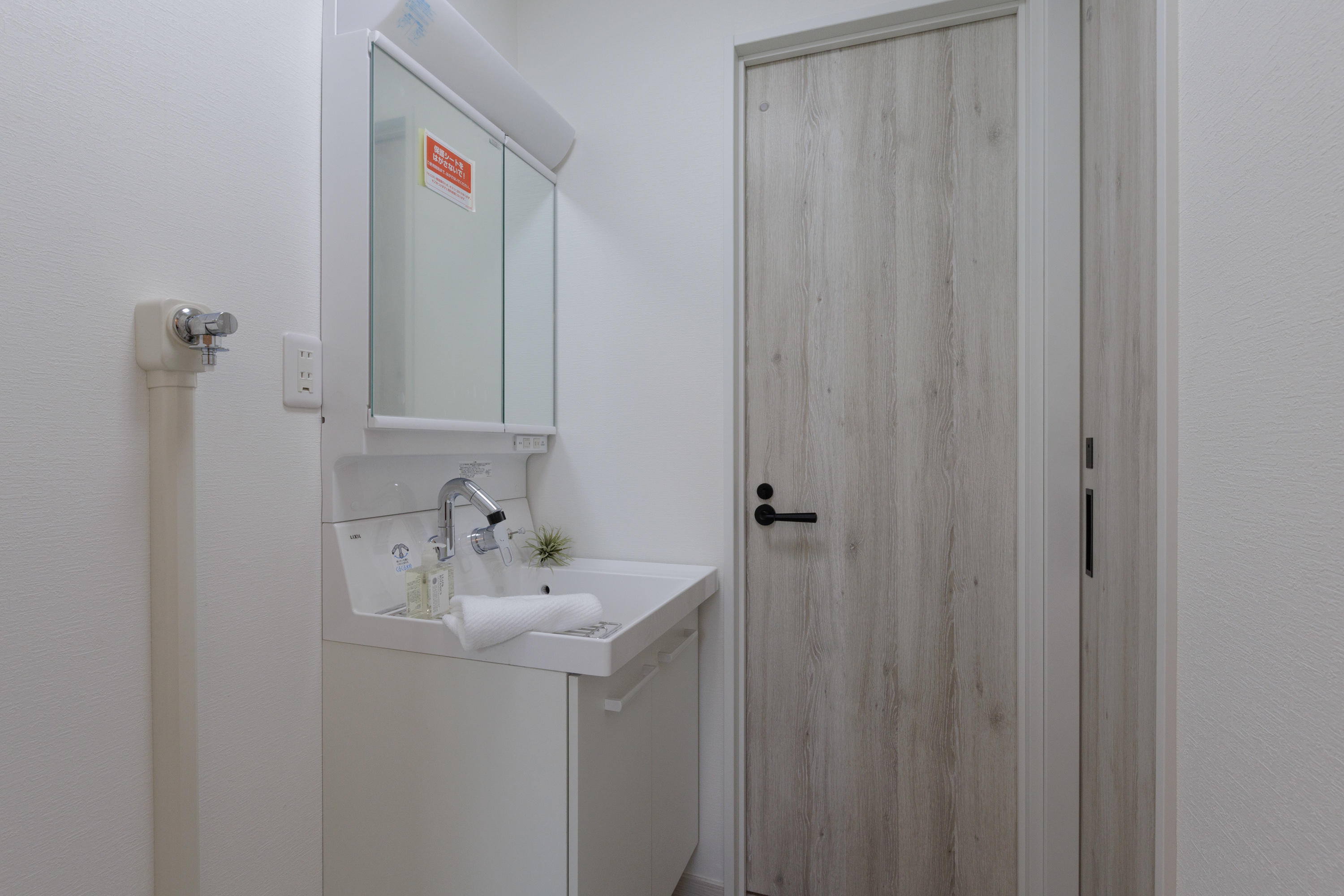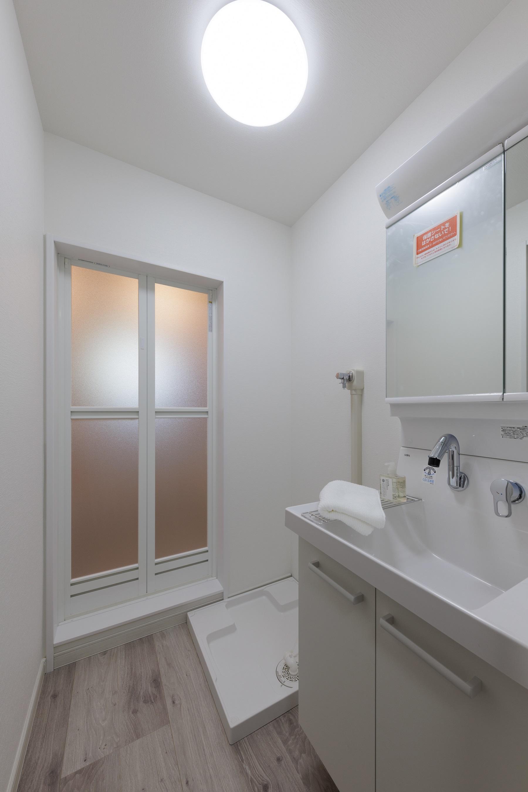 写真からちらっとキッチンが見えるの分かりますか? 以前はカーテン等で仕切らないと脱衣場もない状態の洗面室でした。 独立した洗面脱衣室から浴室へ入れるよう間仕切り壁と室内扉を新設し、清潔感のあるホワイトと木目で空間をコーディネートしました。