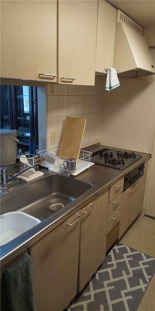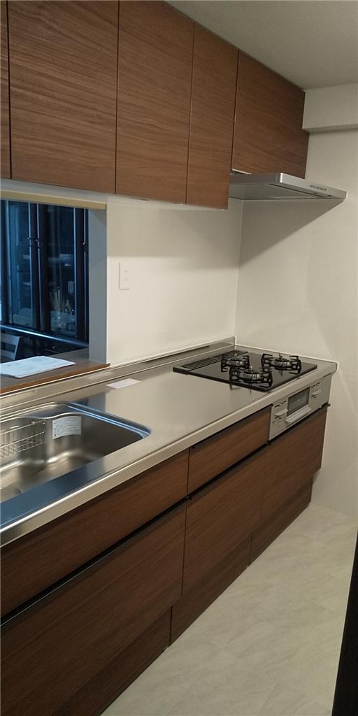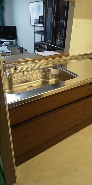 壁と床のホワイトと、引き出しや収納扉のブラウンのコントラストがシックな印象を与えるキッチンです。洗い物がはかどる広々シンクの横は、作業スペースが以前より広がってさらに料理がしやすくなりました。