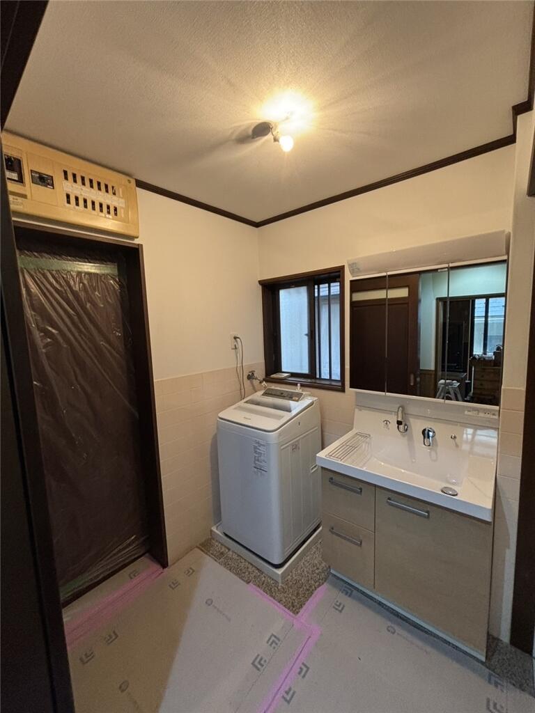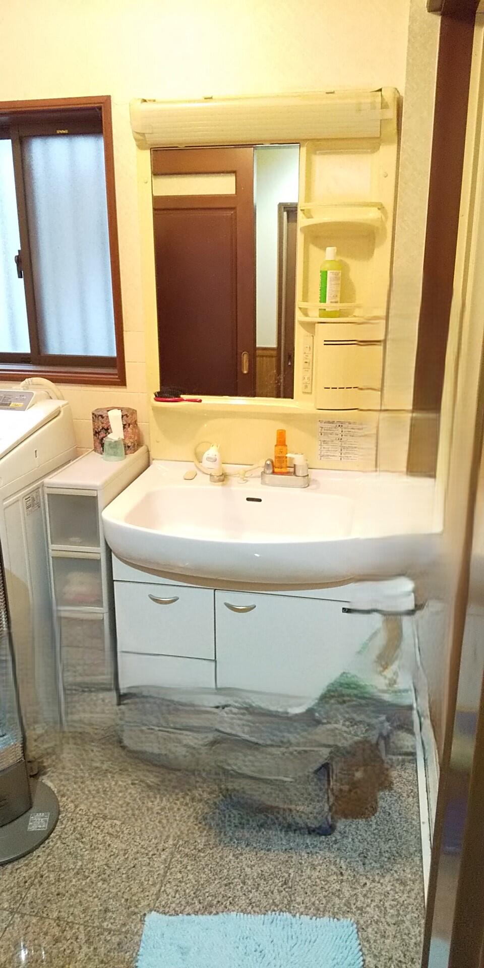 洗濯機とのデットスペース幅分も生かした幅広の洗面化粧台へ交換しました。 三面鏡と広々洗面ボウルで毎日の身支度がもっとしやすくなります。 内装もベージュ系で統一し、洗面化粧台と同系色のナチュラルな空間に仕上がりました。