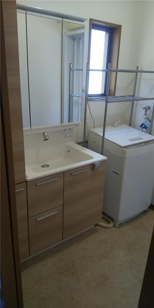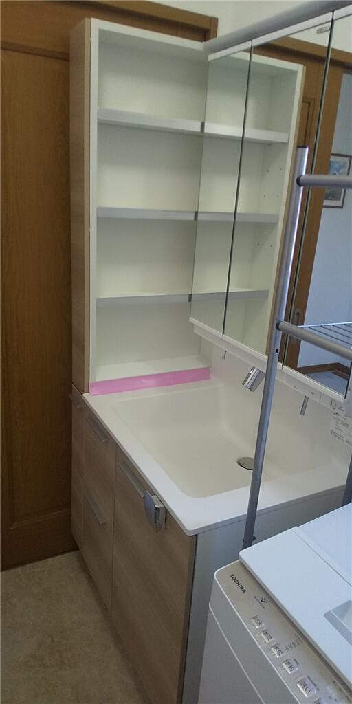 限られた空間をより効率的に使えるよう、スリムで収納力のあるトール収納を洗面化粧台と揃えました。 ホワイトとナチュナル色で統一され、洗濯機と洗面台の動線をそろえることで、見た目がスッキリし、使い勝手の良い空間になりました。