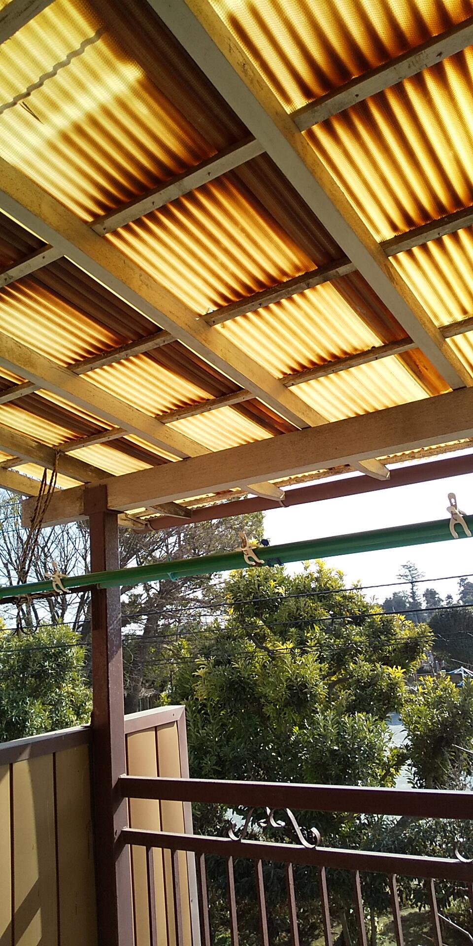 ベランダの波板は、日差しや雨風の影響で年々劣化していきますが、特に日焼けによって黄色く変色し、見た目も古くなり劣化が進んでいる状態でした。