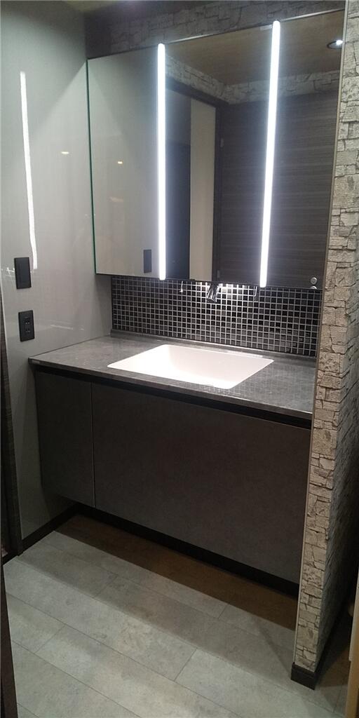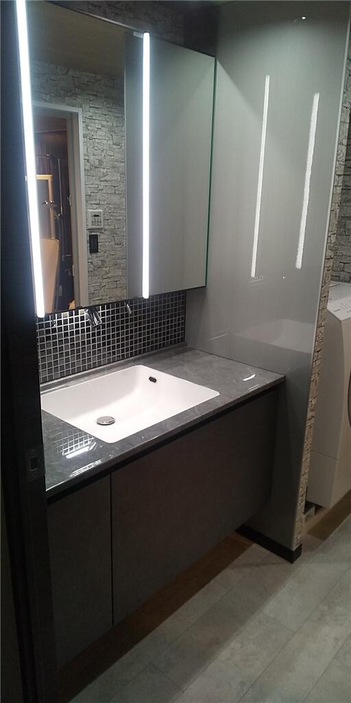 ボウルと一体型になったカウンターはすっきりとしていてお掃除がしやすく、大理石調の柄が印象的なデザイン。水栓は鏡面下についているタイプになり、タッチレスで手を触れずに水やお湯を出せる衛生的な水栓になります。
