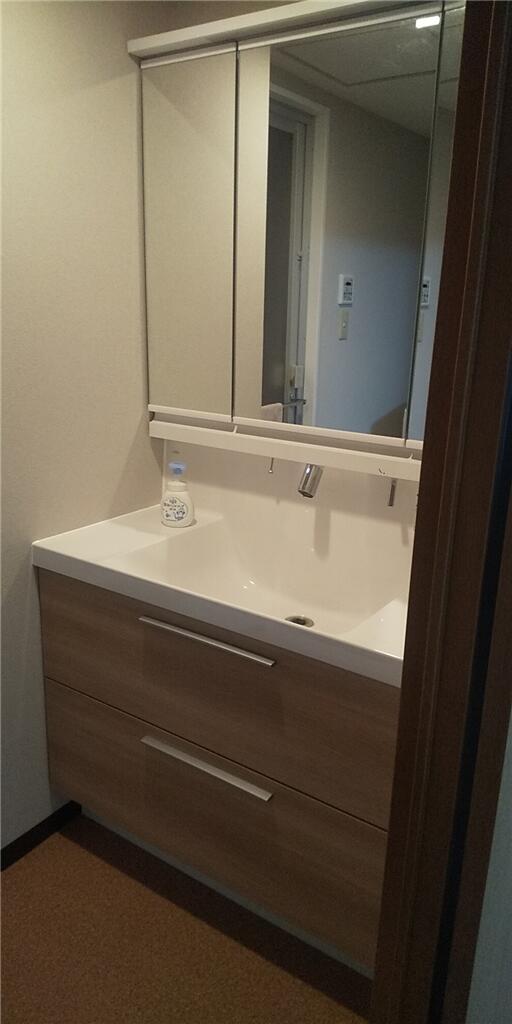 サイズは以前のものと同じですが、大容量が確保された洗面台に交換しました。 「大きなもの」はたっぷり入るスライド収納へ、「小さなもの」は三面鏡裏へ分けることで、さまざまなサイズのものをすっきり収納できるようになりました。 洗面ボウルは水撥ねがしにくい形状となっており使い勝手が抜群で、清掃性も良いので手洗いのお洗濯にも最適です。
