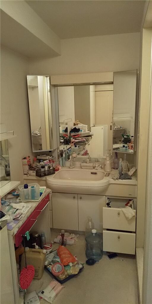 以前は鏡裏収納が少なく、外置きになっていた小物類が三面鏡裏に収納スペースが増えたことで、今まで見えていた洗面用品も納まりスッキリとした印象に。