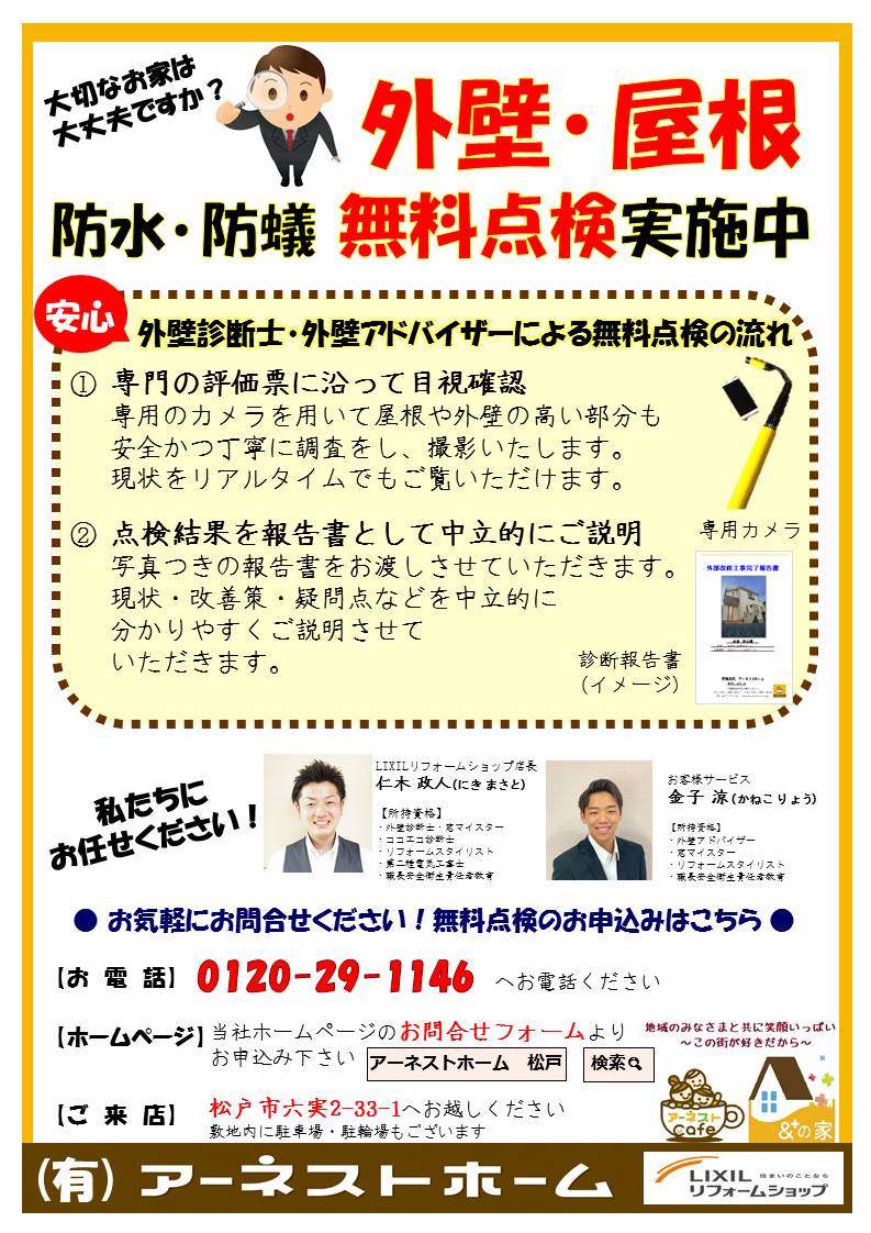 屋根・外壁・防水・防蟻の無料点検をさせていただいております。