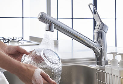 吐水口に内蔵されたセンサーが物や手の位置と動きを感知して、吐水も止水も自動で行います。シンク作業がラクになって、節水もできる水栓です。