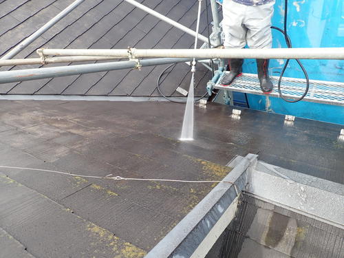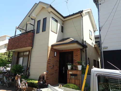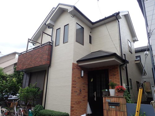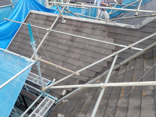 足立区入谷で屋根・外壁塗り替え工事をお願いされました。 現場は屋根が急勾配なので、屋根足場も組ませていただきました。