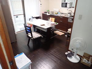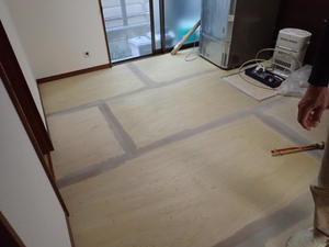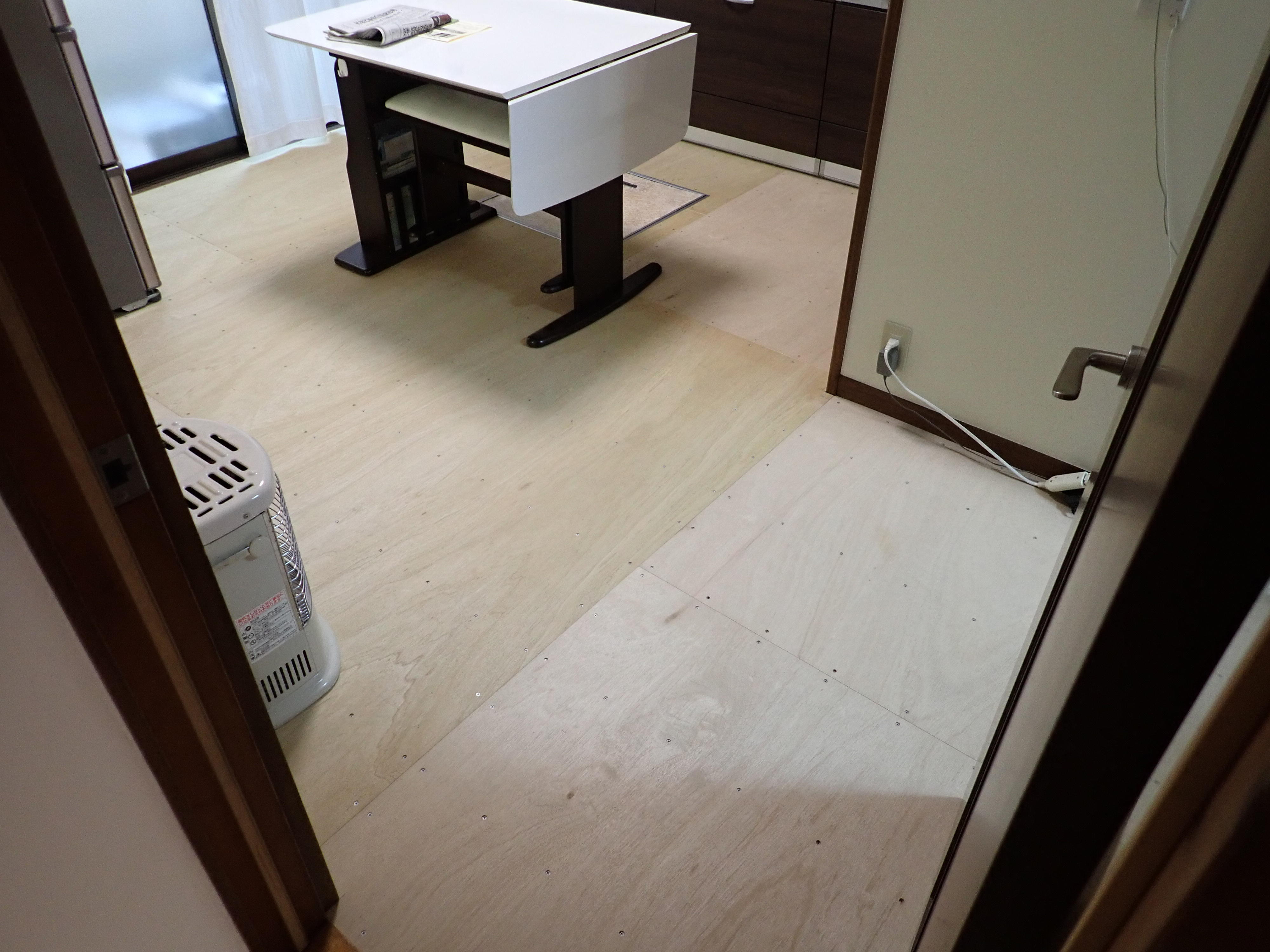 お客様から「台所の床がペコペコしていて抜けそう、根太までダメになっているんじゃないかと心配」と、お問い合わせいただきました。現場を見させていただくと、確かに床がペコペコしていました。ただ、根太は大丈夫だったので、お客様には根太の位置をお知らせして実際に根太の上にのって根太は大丈夫ですとご説明させていただきました。根太と根太の間のベニヤが弱っていてペコペコしていたようです。