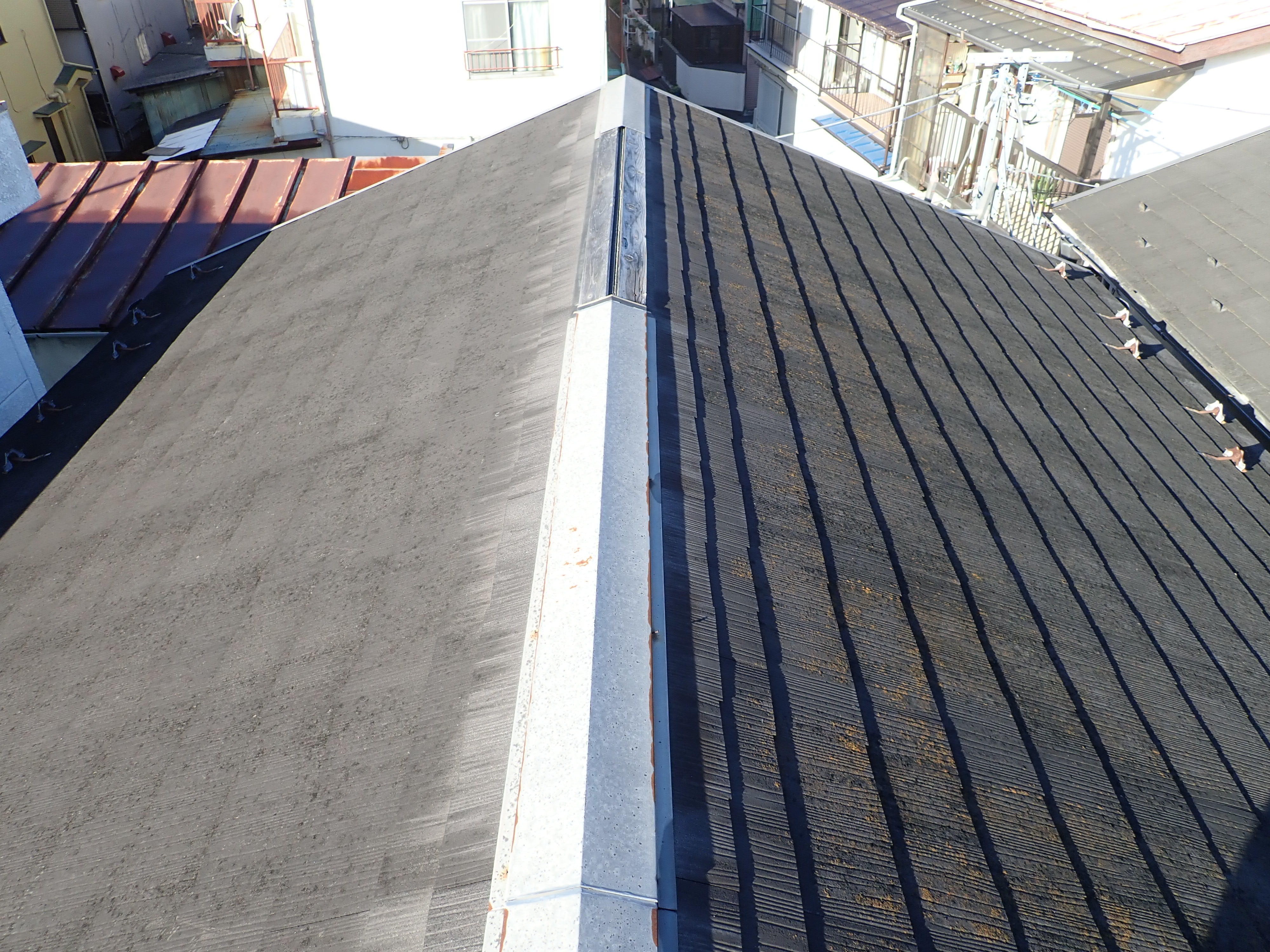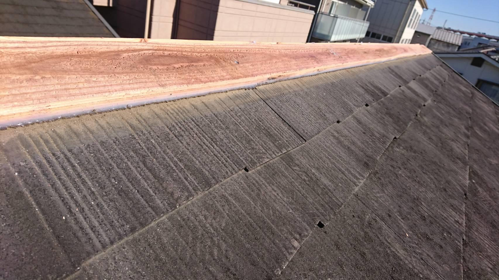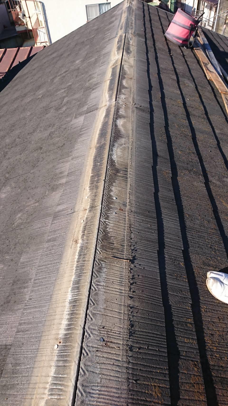 近所で工事をしていた業者さんに屋根が飛んでいると言われたから見て欲しいとお問い合わせがありました。 屋根屋さんと一緒に現場へ行き屋根の状況を確認させていただいたところ、棟板金が1枚飛ばされてしまっていました。