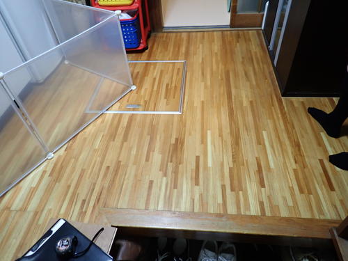 足立区入谷にあるOB様が大家さんの賃貸でフローリング重ね張り工事をさせていただきました。既存フローリング材がペコペコしていると言われていたので、現場を見に行かせていただきました。フローリング材はペコペコしていたのですが、フローリング材を支えている根太部分はしっかりしていたので、既存フローリング材をはがさずに重ね張りをさせていただきました。敷居と既存フローリングに段差があったのですが、フローリング材を重ね張りしたことによって段差がほとんどなくなりました。