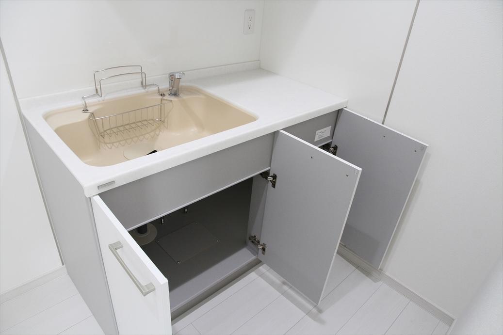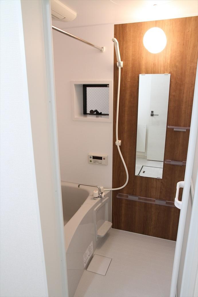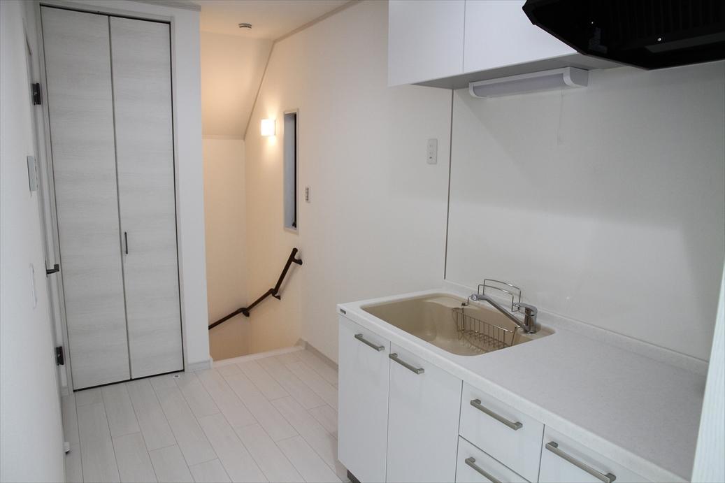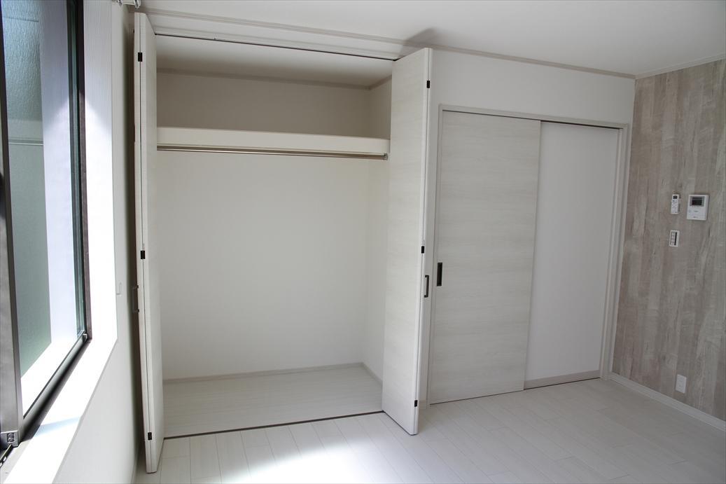 2所帯の賃貸住宅で、内装の床や建具は、ホワイト基調の明るい部屋になりました。アクセントで壁の一面に木目調のクロスを張っています。借主さんもすぐに決まったようで、オーナーさんもいい建物ができたと喜んでいただきました。