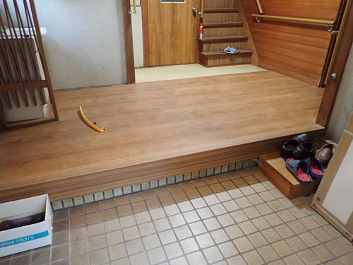 工事完了後にペコペコしていた箇所を歩いていただき確認していただきました。 「ペコペコしなくなったし、新しいフローリングの色も良いね!」と仕上がりにご満足していただけたようで良かったです。