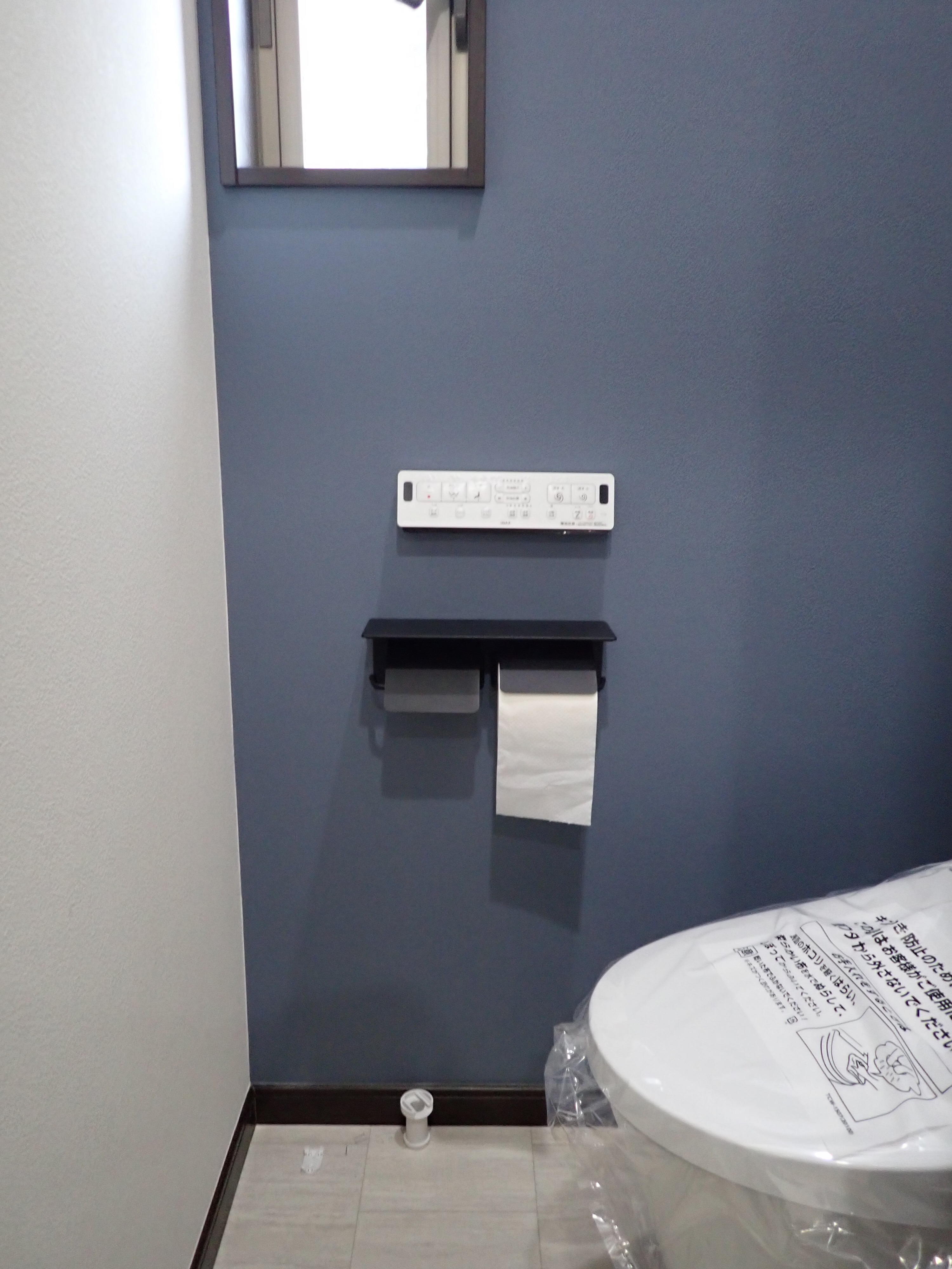 洗面化粧台「収納が多くなって使いやすくなった!」と喜ばれていました。トイレの方は壁面のクロスを1面だけアクセントクロスにしておしゃれになりました。こちらも気に入っていただけたようで良かったです。
