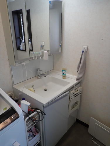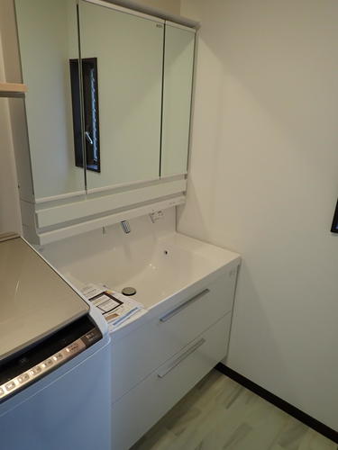 足立区千住のOB様の現場で洗面化粧台・トイレ交換をさせていただきました。今回の工事のメインは洗面化粧台でした。既存洗面化粧台の間口が75㎝だったのですが、モノを収納しきれずに困っていたようです。お客様のご希望としては間口をサイズアップして収納力を増やしたいとのことでした。一般的に洗面化粧台の間口は75㎝の上のサイズは90㎝になっています。現場調査をさせていただいたところ、間口90㎝の洗面化粧台が入るスペースがありましたので、サイズアップさせていただきました。