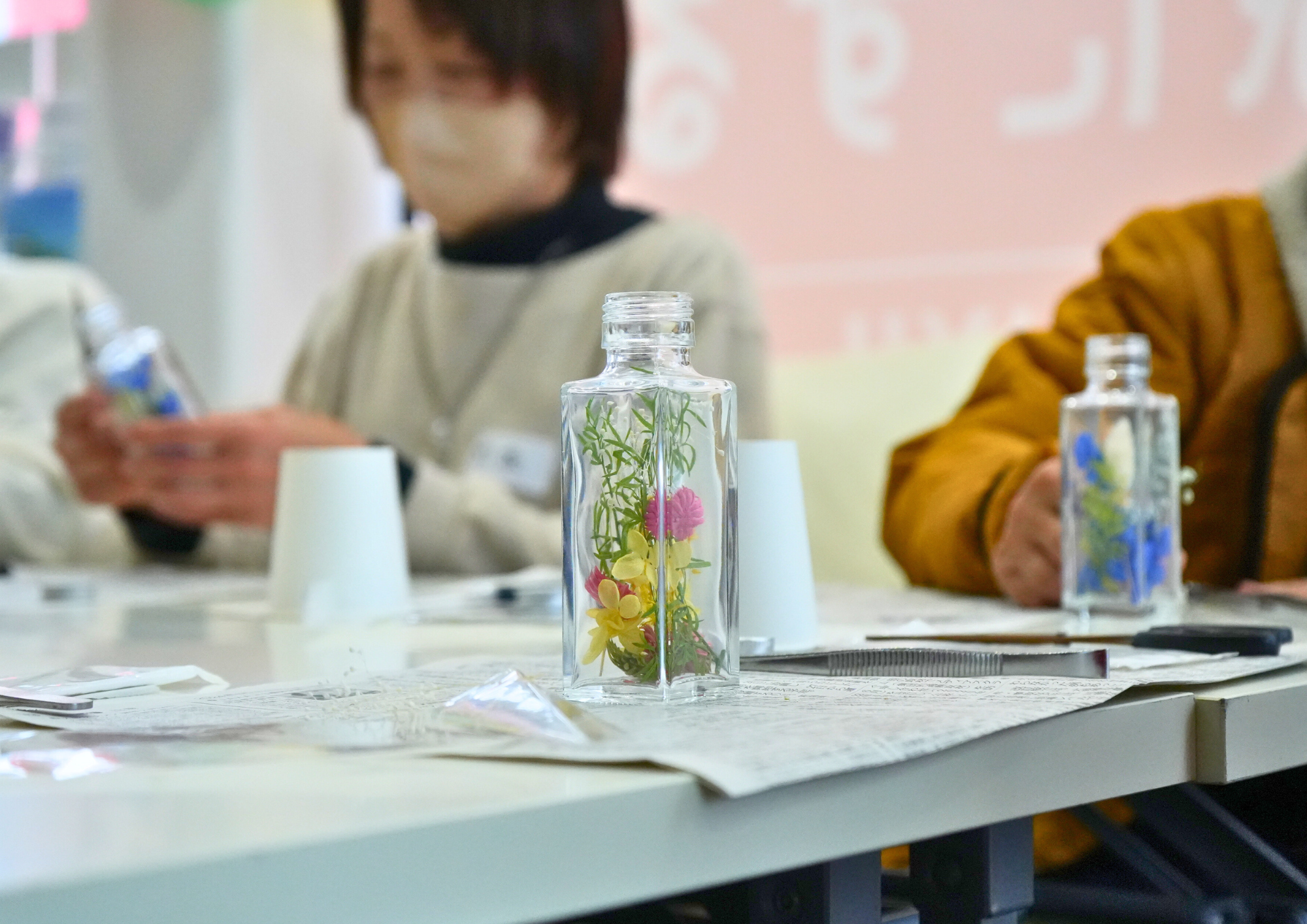 制作体験はハーバリウムが大人気!オイルを入れると鮮やかな色になります。