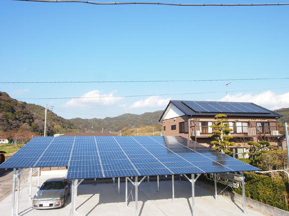 以前、持ちアパートの屋根に(写真右奥)太陽光発電設備を設置させていただいたH様が弊社の駐車場に設置しているカーポート型太陽光発電設備を気に入ってくださり、弊社よりはるかに大きな設備を設置していただきました。日当たりもバッチリ!圧巻です!