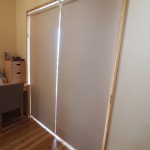 勝手口は、ドアクローザ―とドアノブがあるので、ロールスクリーンと干渉しないように逆巻のスクリーンに変更し、部屋内側に近い方にスクリーンが下りてくるようにしました。
