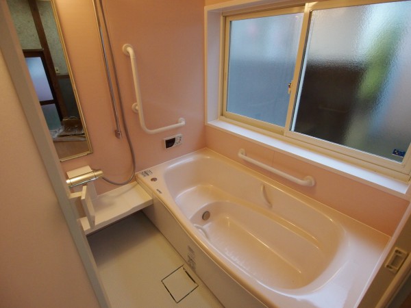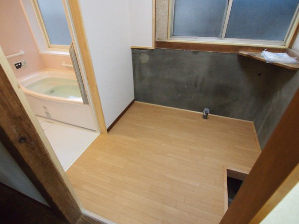 浴室と土間の壁を解体し、広い浴室を少し小さくし、もともと土間だったスペースに床を作り、新しく脱衣場にリフォーム!お風呂もシステムバスに変更し、脱衣場も新しくでき、洗濯機も近くに!快適な浴室、脱衣場になりました。