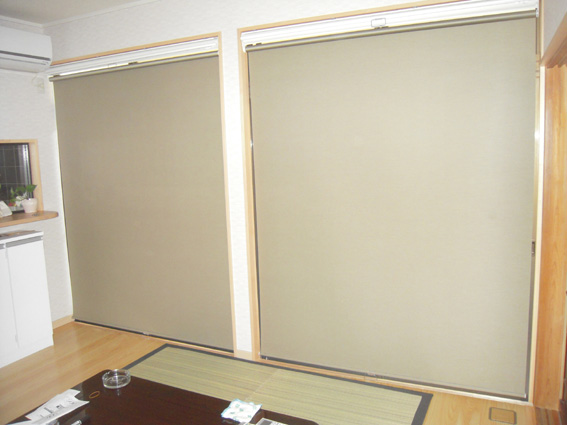 リビングの掃出窓は、昼間の日差しをカットする為に、厚手のロールスクリーンと薄手のロールスクリーンを組み合わせて、1台で2枚のスクリーンをお取付でき、光の調整が可能なものをお選びいただきました。1台のお取付なのでとても、すっきりと納まりました。