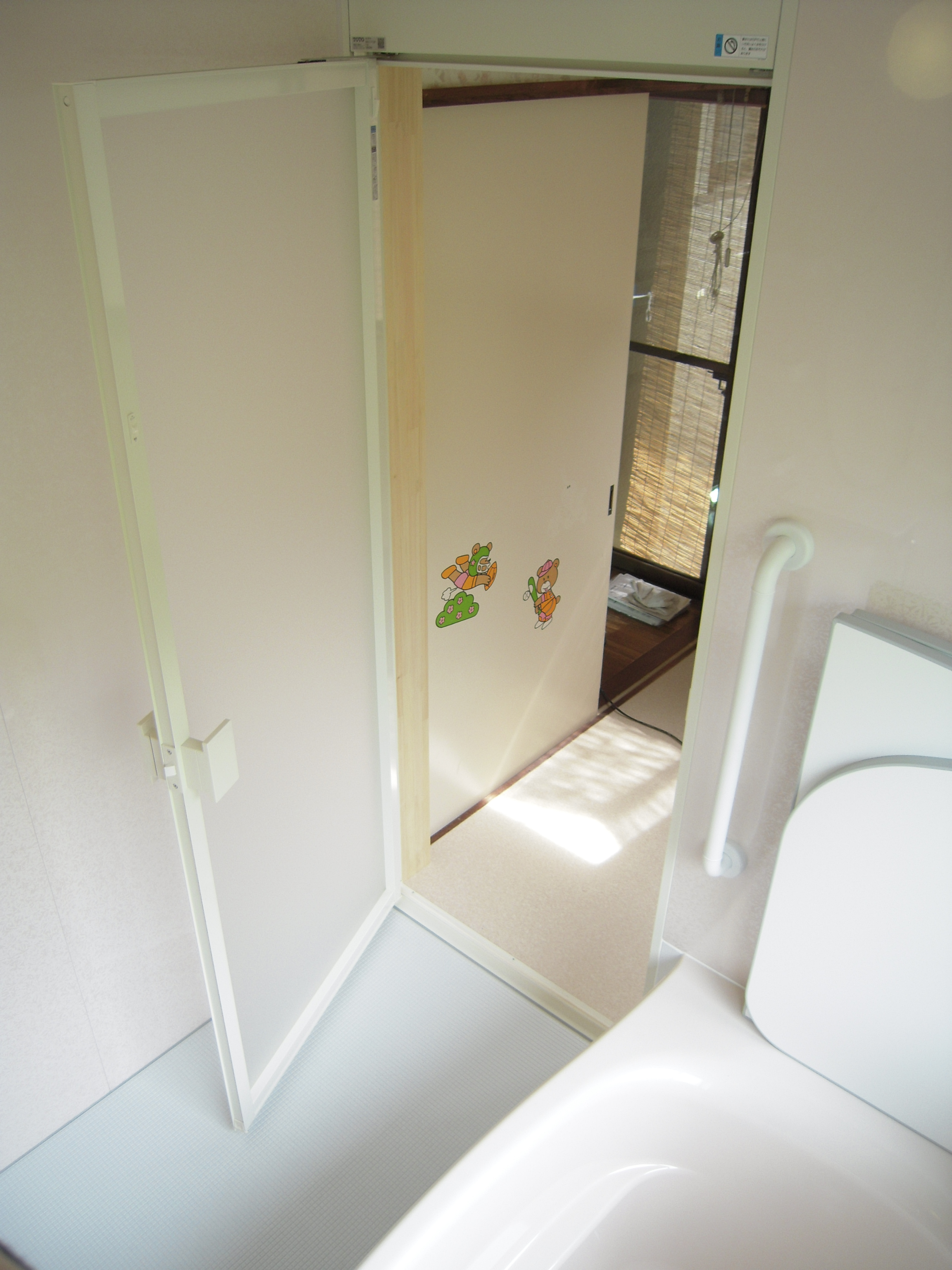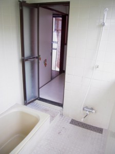 タイル張りの浴室で外からも入ることができる出入口がある浴室を、外からの出入口をなくし、システムバスルームにリフォームをお勧めしました。とても暖かくなってお客様にも大変喜んでいただきました。