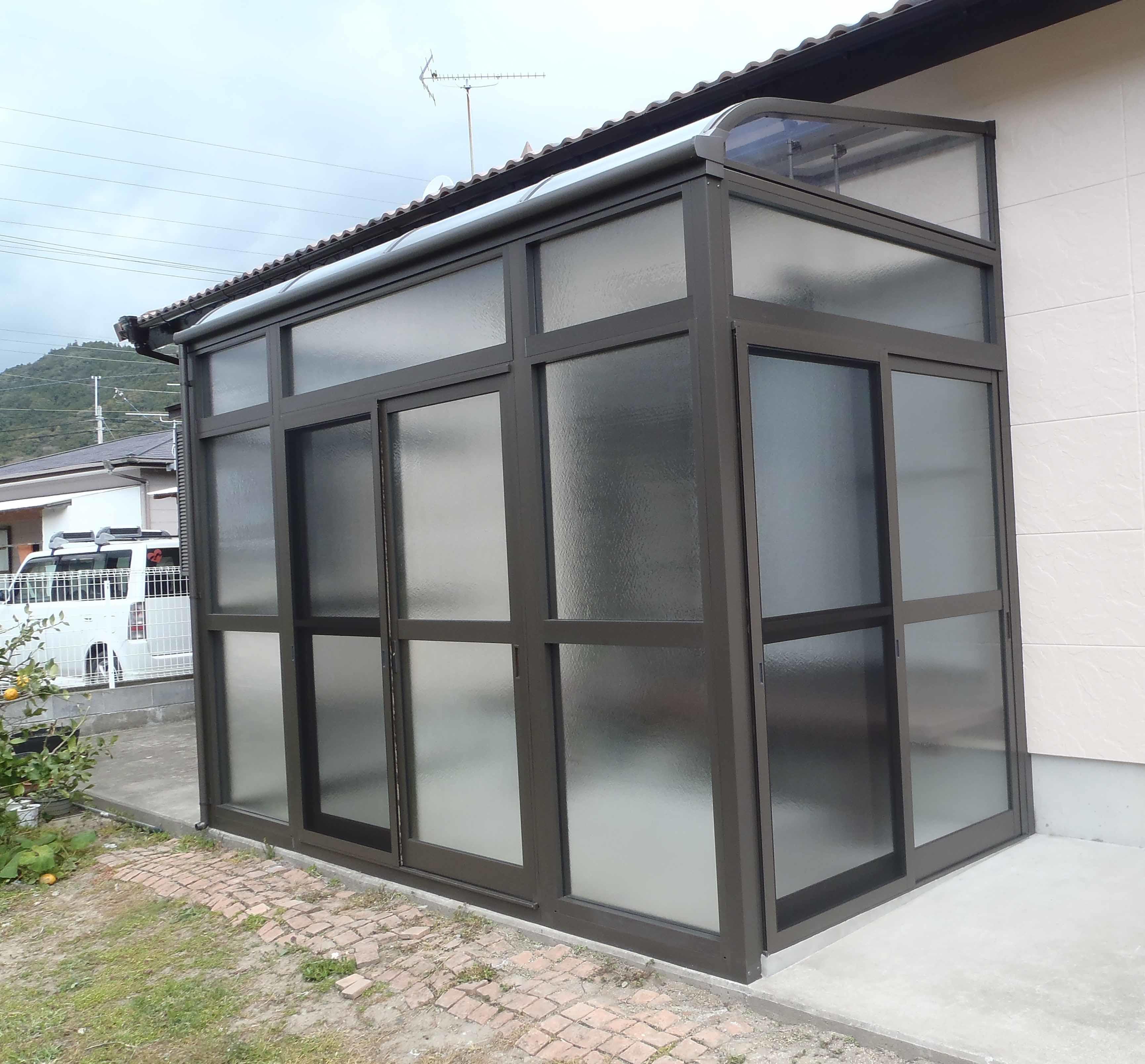 苗作りの為の温室との事でしたので、土間納まりタイプで施工しています。 屋根材の「熱線吸収アクア ポリカーボネート」は、明るさを保ちつつ、熱線をカット。美しさを保つ防汚機能もついています。 扉・窓が通風を考えて設置されているので、風通しが良く、洗濯物を干す時にも大活躍してくれます。
