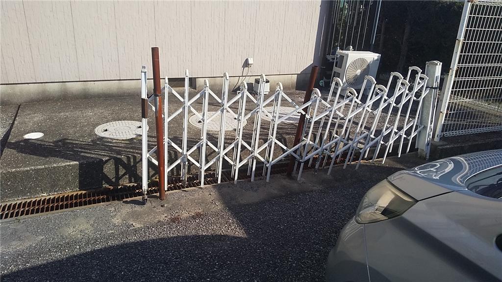 駐車場とアパートとの境界に設置の伸縮門扉が