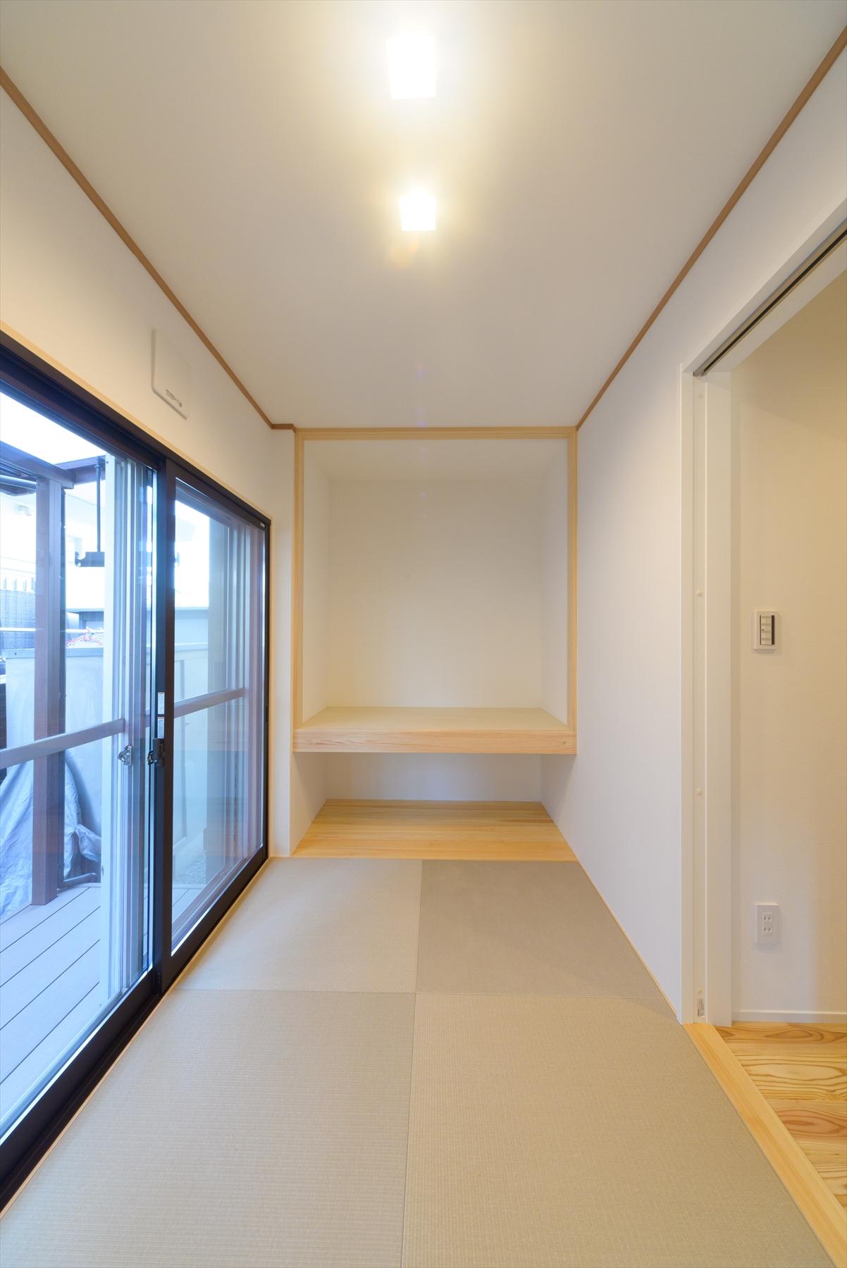 浴室から物干し場へつながる畳スペース。取りこんだ洗濯物をたたんだり、ごろ寝をしたり、ほんの少しでも腰を据えてくつろげる場所があると暮らしにゆとりが生まれます。