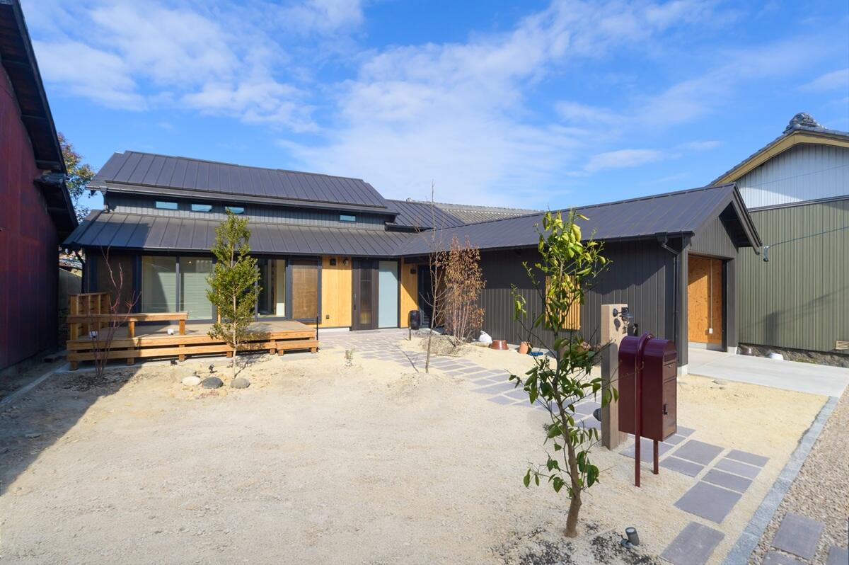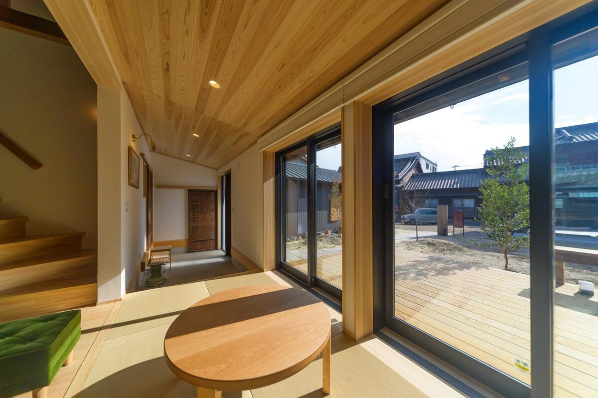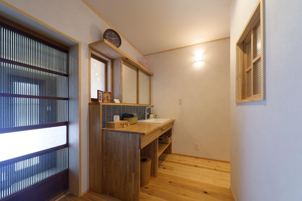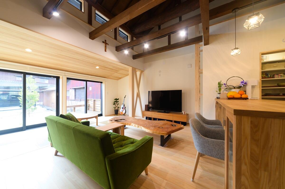 奥様の祖父母が暮らしていた家を譲り受けリノベーションされました。 屋根裏に眠っていた古材の梁をきれいに塗装して、吹き抜けのダイニングキッチンから見えるようにしました。 古い建具や箪笥なども採用し、空間のアクセントに、古民家の趣を演出しています。