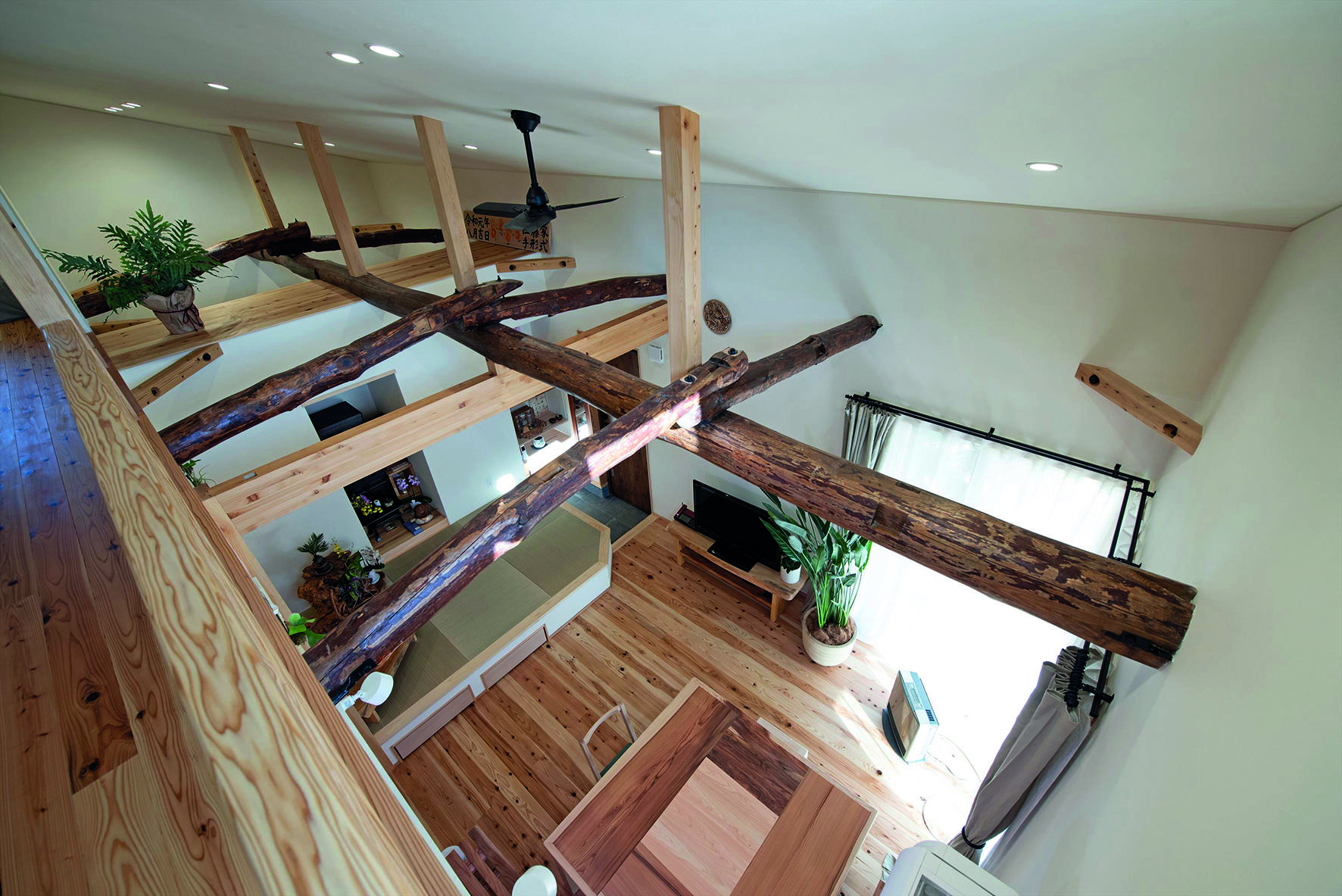 約9メートルの丸太をむき出しにして、家のシンボルに。