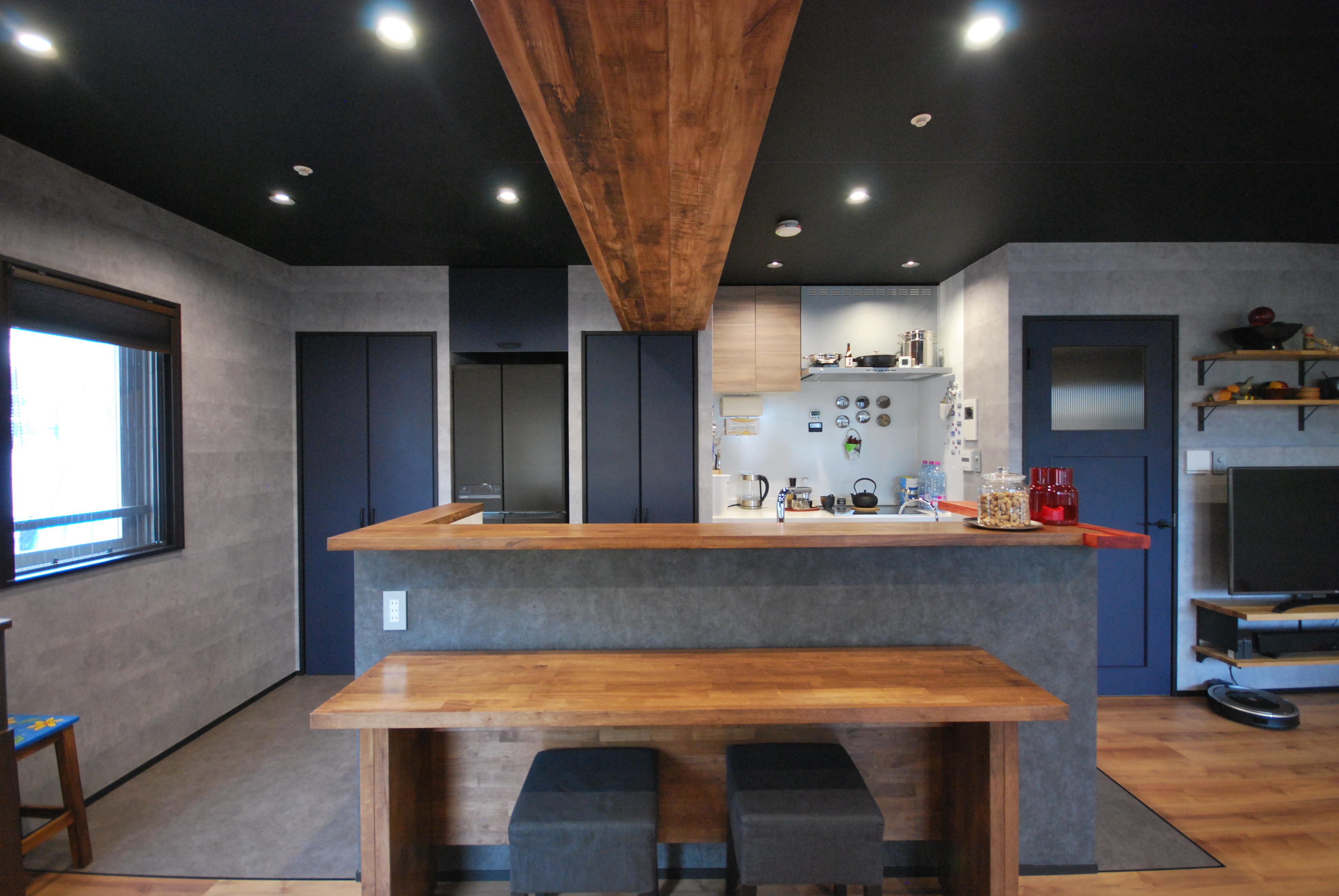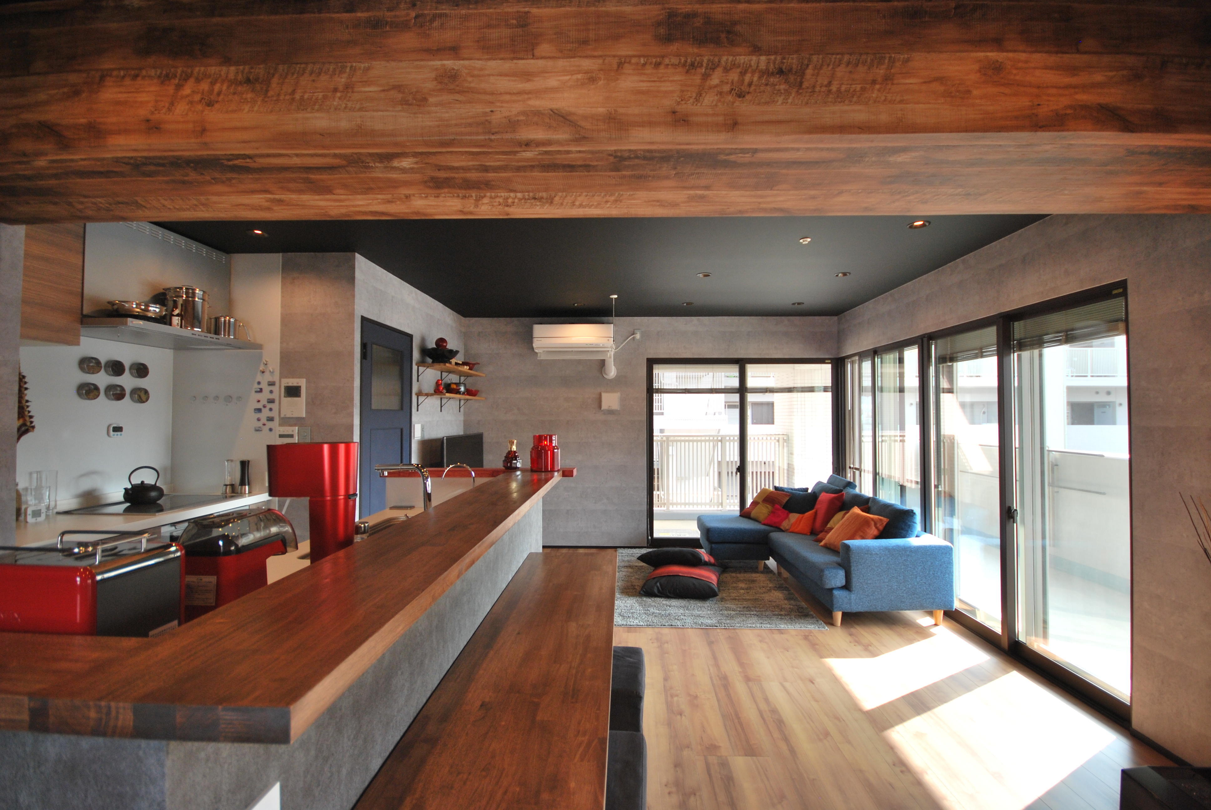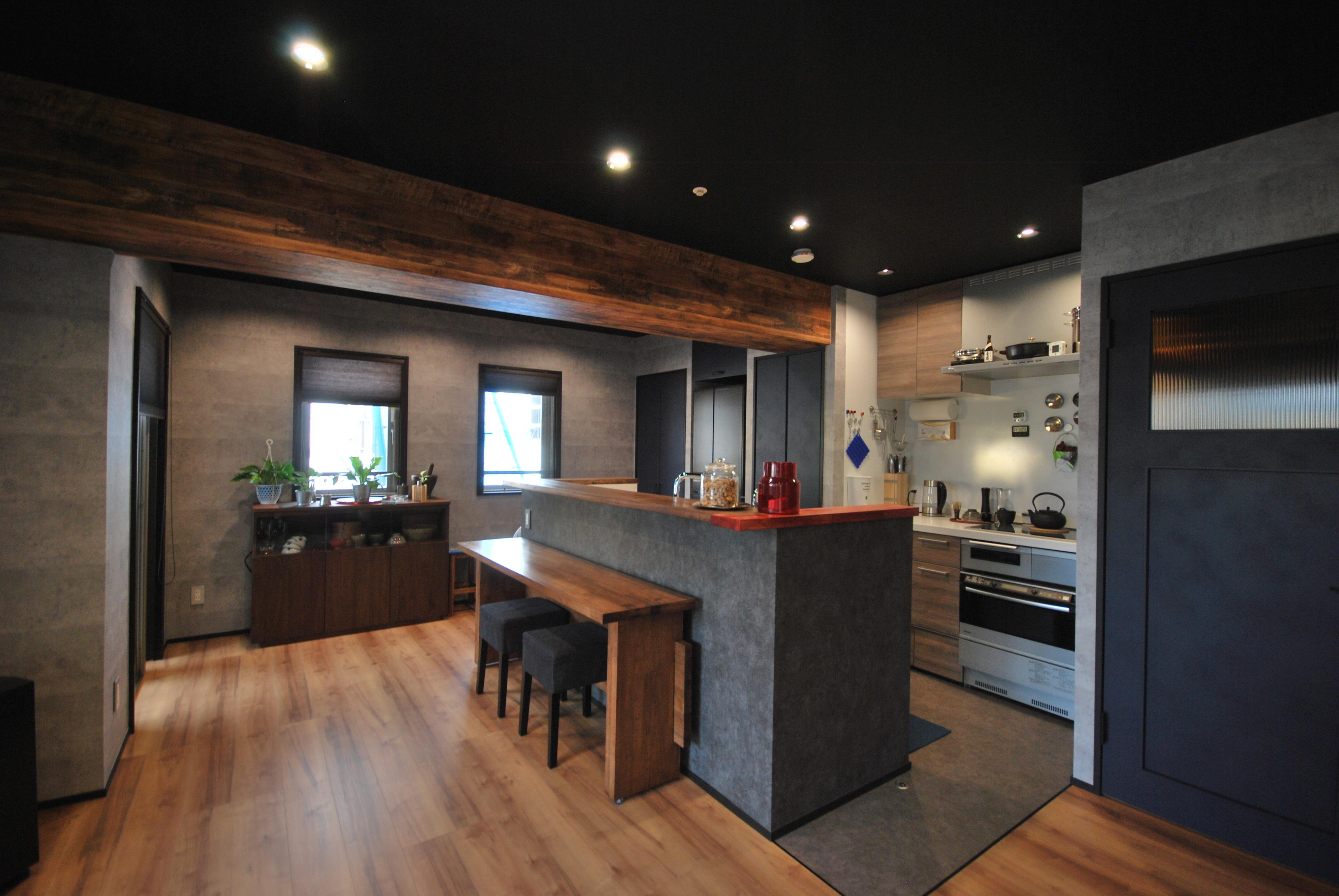 お料理好きなお客様。一番長く過ごしたいキッチンが狭く壁に囲われた閉鎖的な空間でした。使いにくいダイニング横の洋室の壁を取り、LDKを一部屋にし広々と開放的なキッチンにしたい!というのがお客様のご希望でした。取り除けない梁は木目のクロスでお部屋のアクセントにしました。おしゃれな調理器具をたくさんお持ちでしたので、使いやすく見せるために置く棚やカウンター、隠したい雑貨などの収納庫の位置や大きさは何度も細かく打ち合わせを重ね、お客様の生活スタイルにあったものにしました。