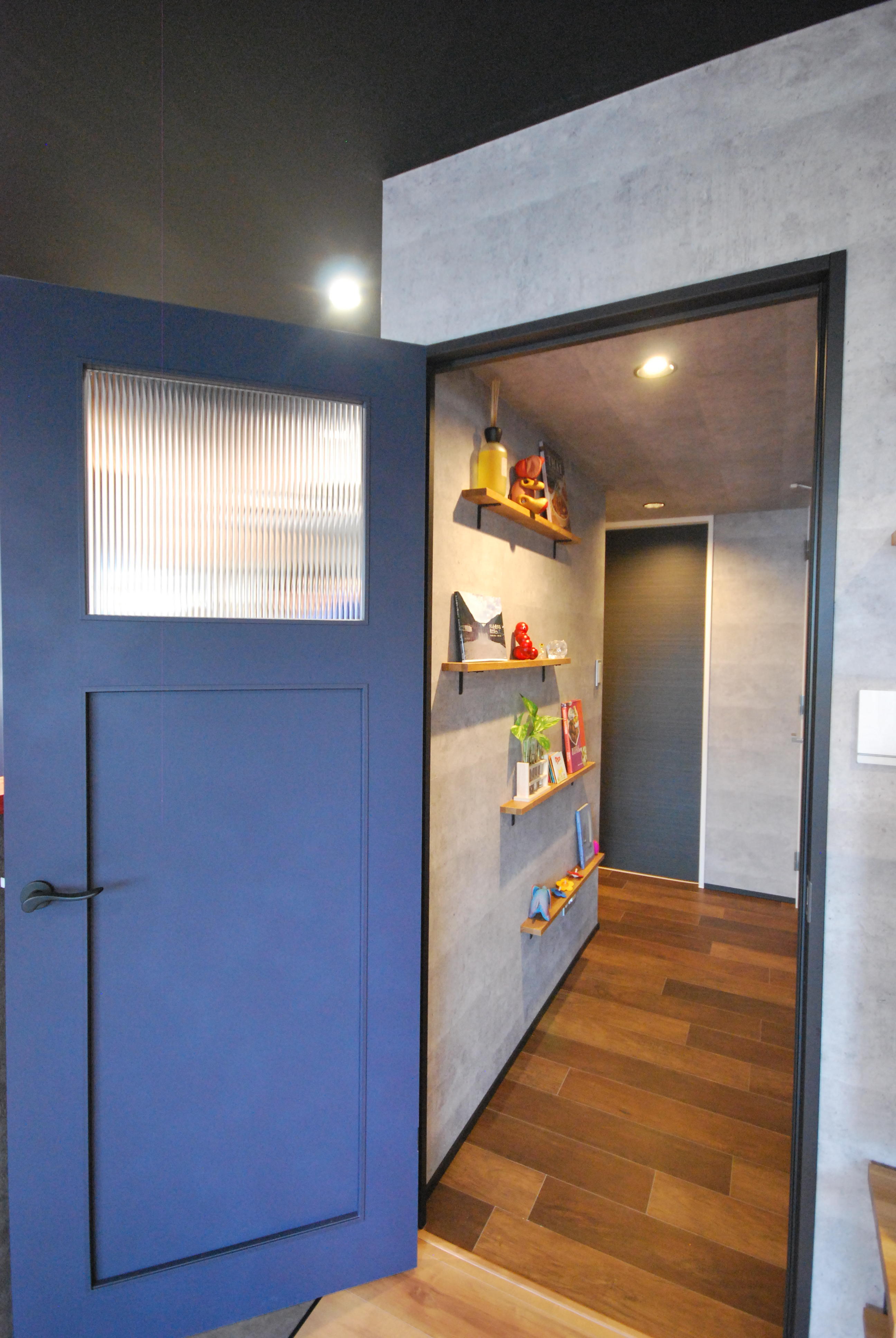 お部屋のアクセントになるネイビーカラーの開きドアにしました。ガラスがあるので廊下へも光が入るようになりました。