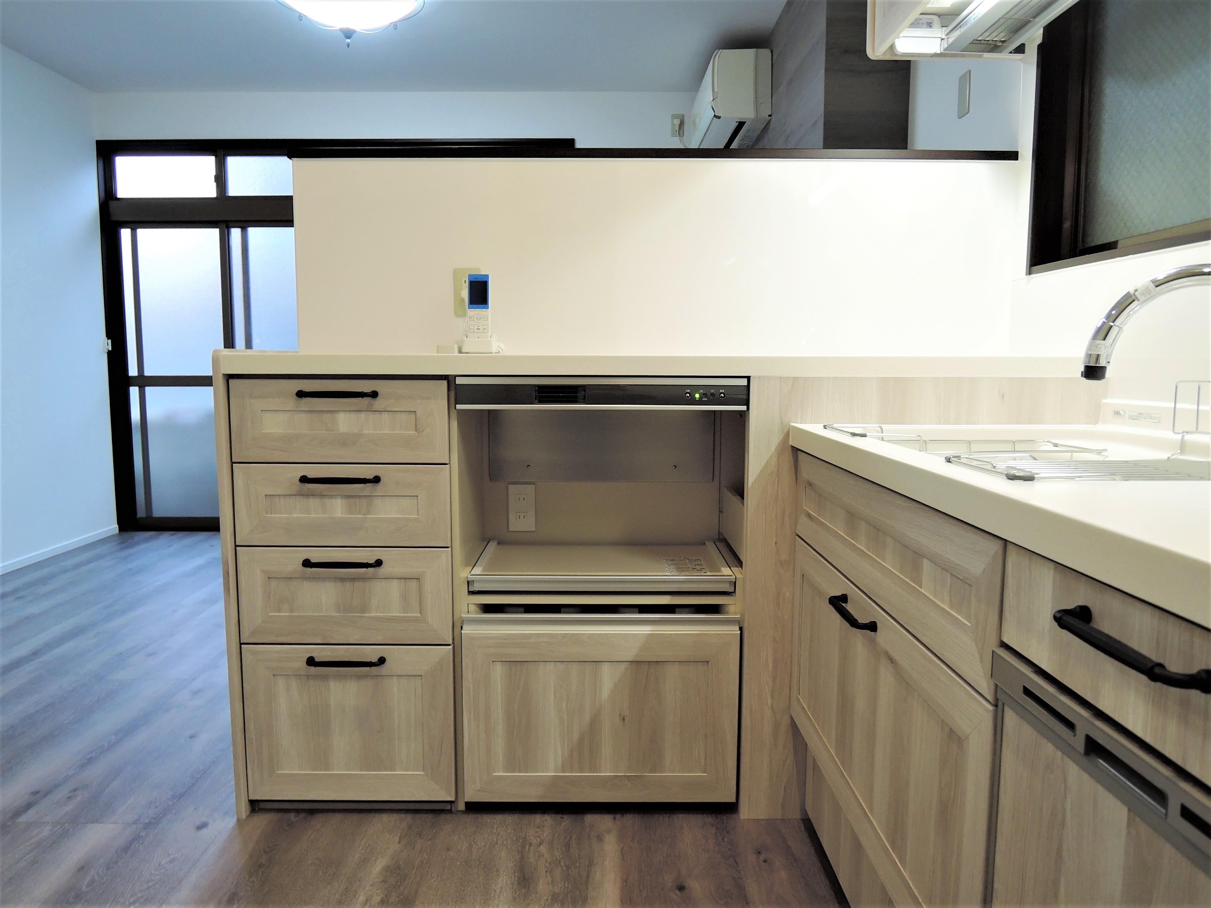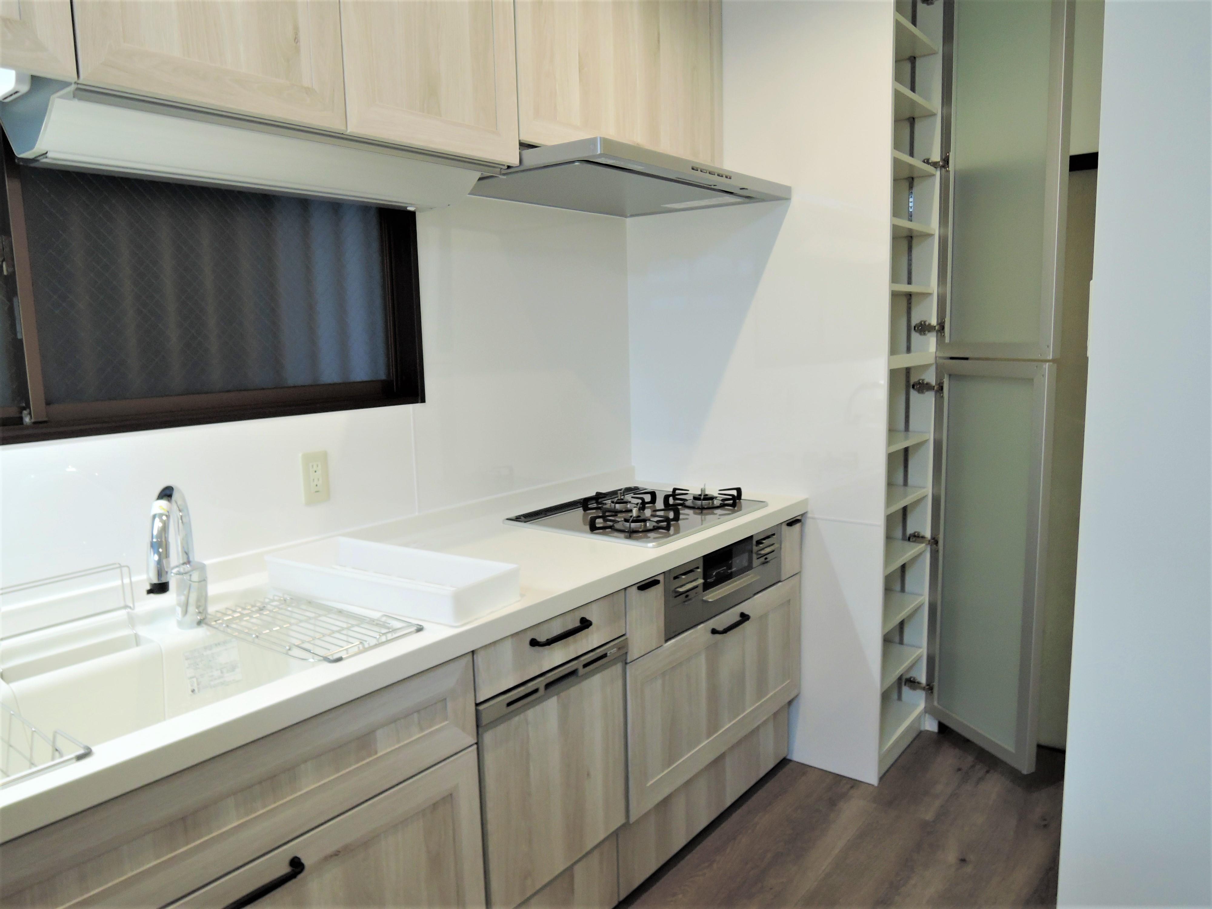 変形の狭いデッドスペースには造作食器棚を作成し、コンロとの境にはキッチンパネルを貼り有効活用できるようにしました。クイックポケット・クイックパレットを設置したので、見た目スッキリで収納力UPできました。