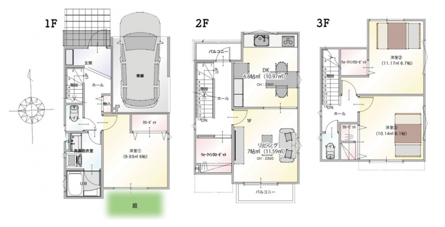 間取り:3LDK+庭付き+カースペース+WIC+南向きバルコニー
