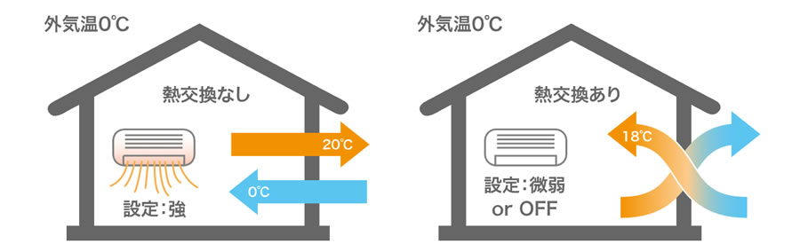 熱交換換気システムで、常にクリーンな空気を循環させ、過ごしやすい室内環境を維持しつつ、換気による内部熱のロスを抑えられ冷暖房に消費する電力を節約することができます。また、従来のダクト式換気システムのように、長いダクトを通して家全体に空気を送る必要が無いため、更に省エネになります。