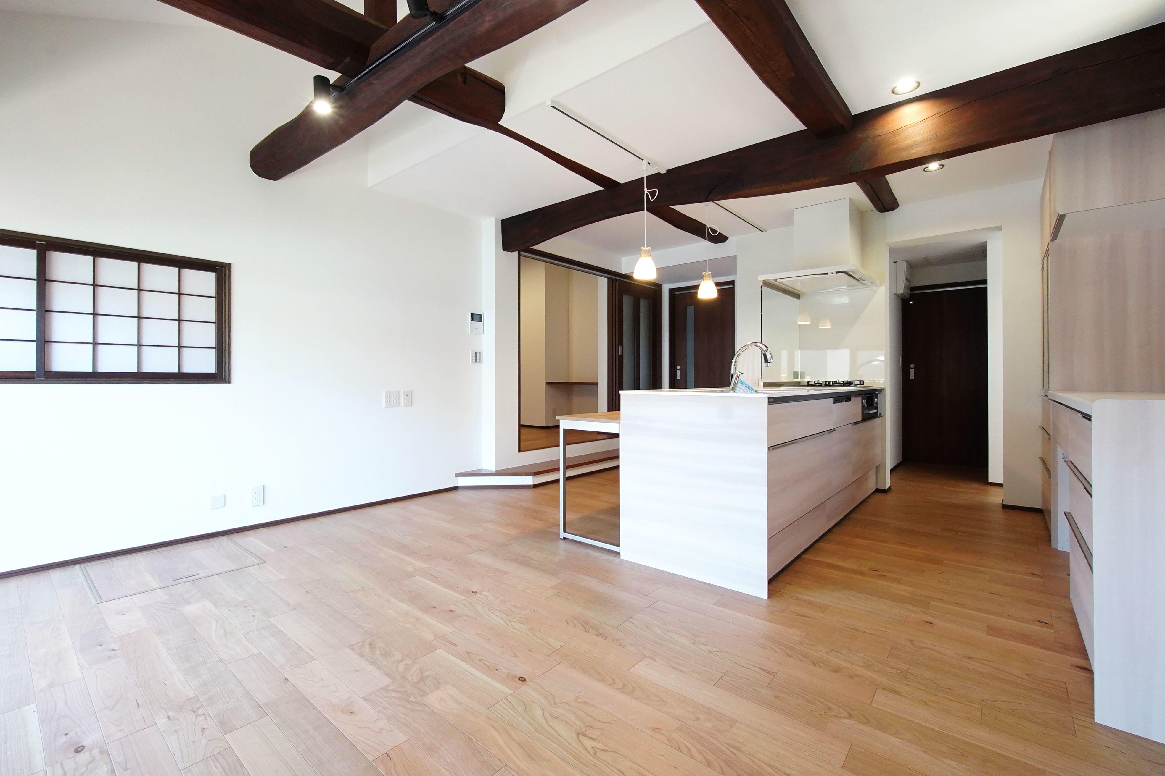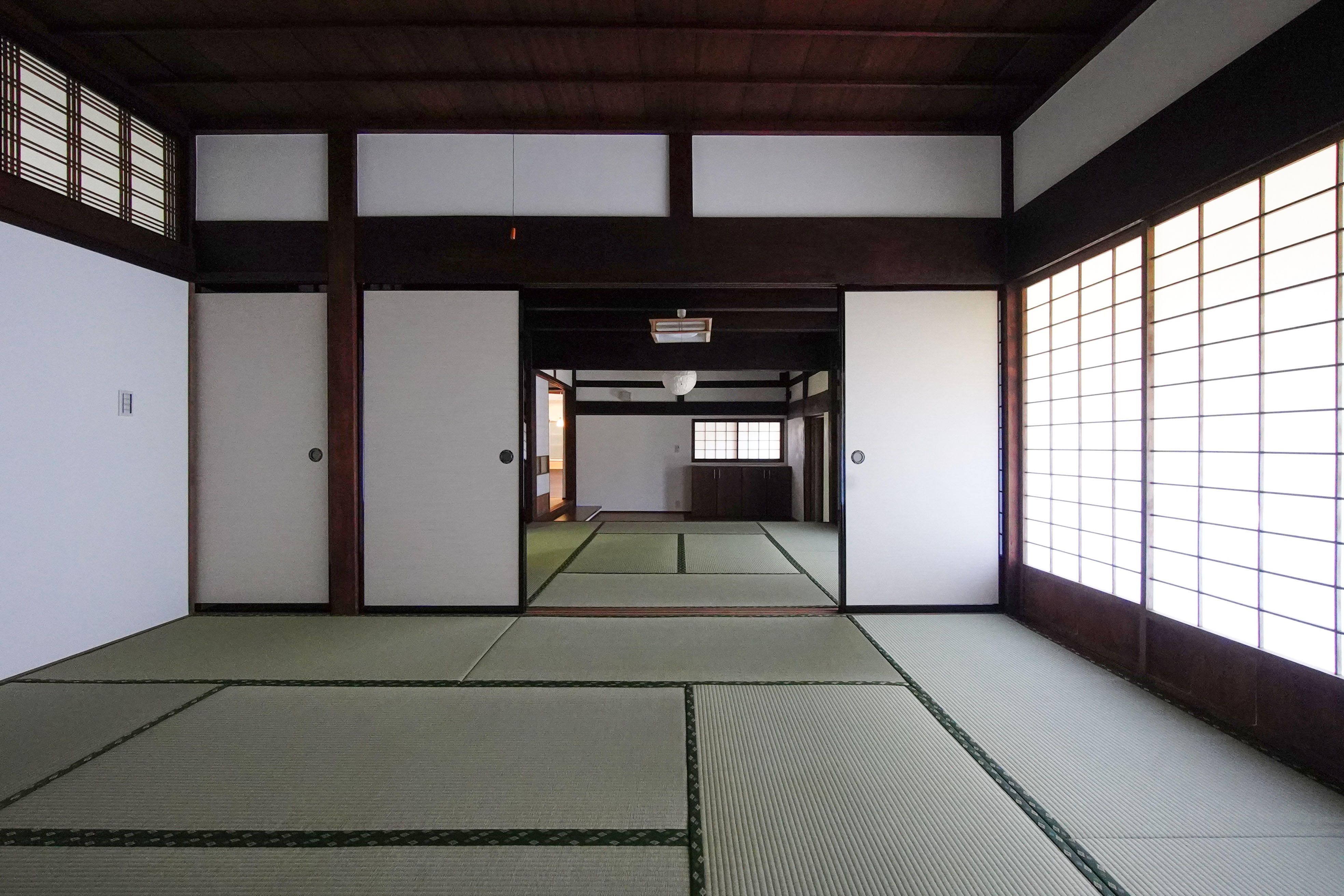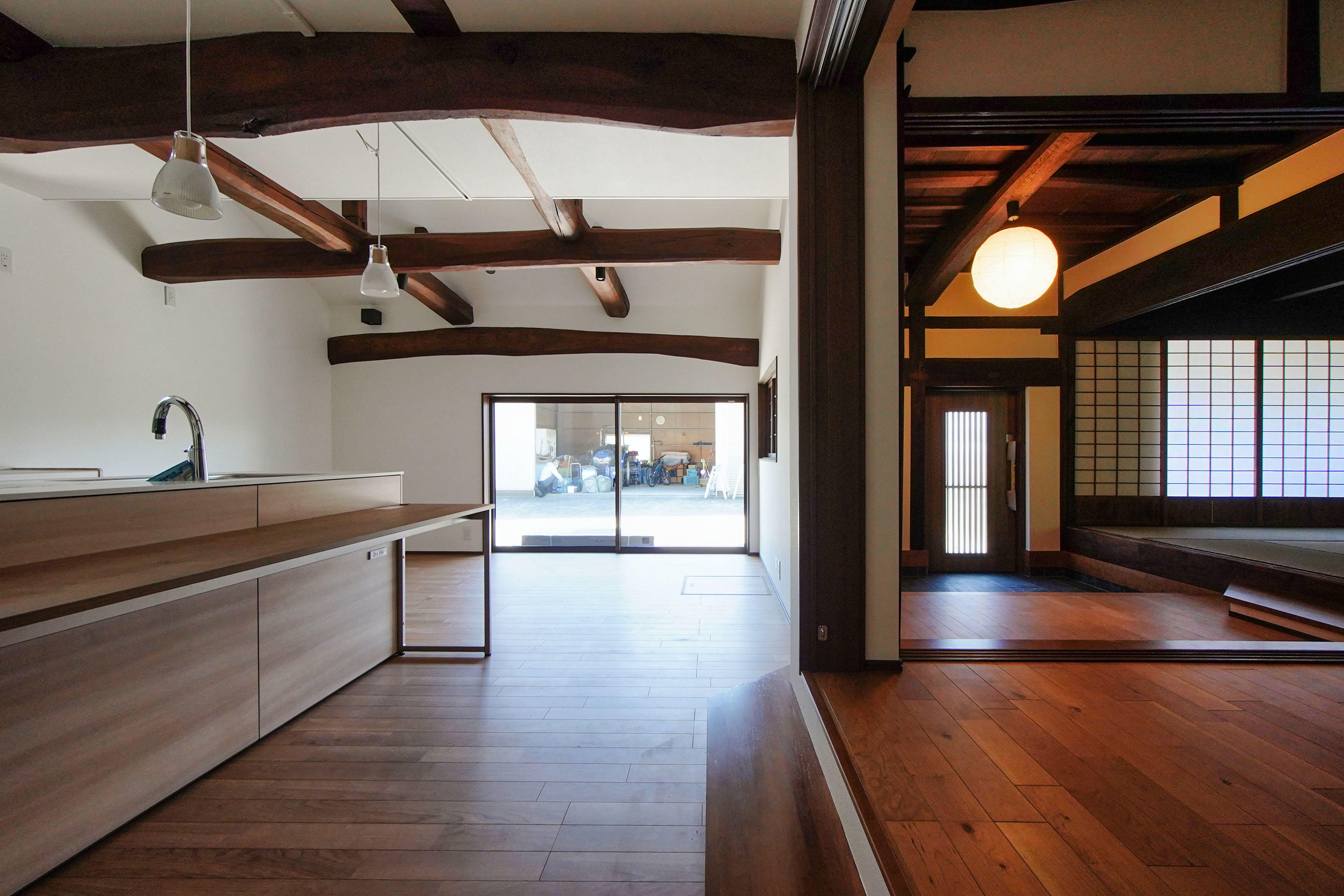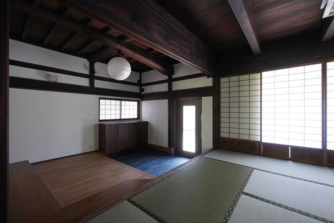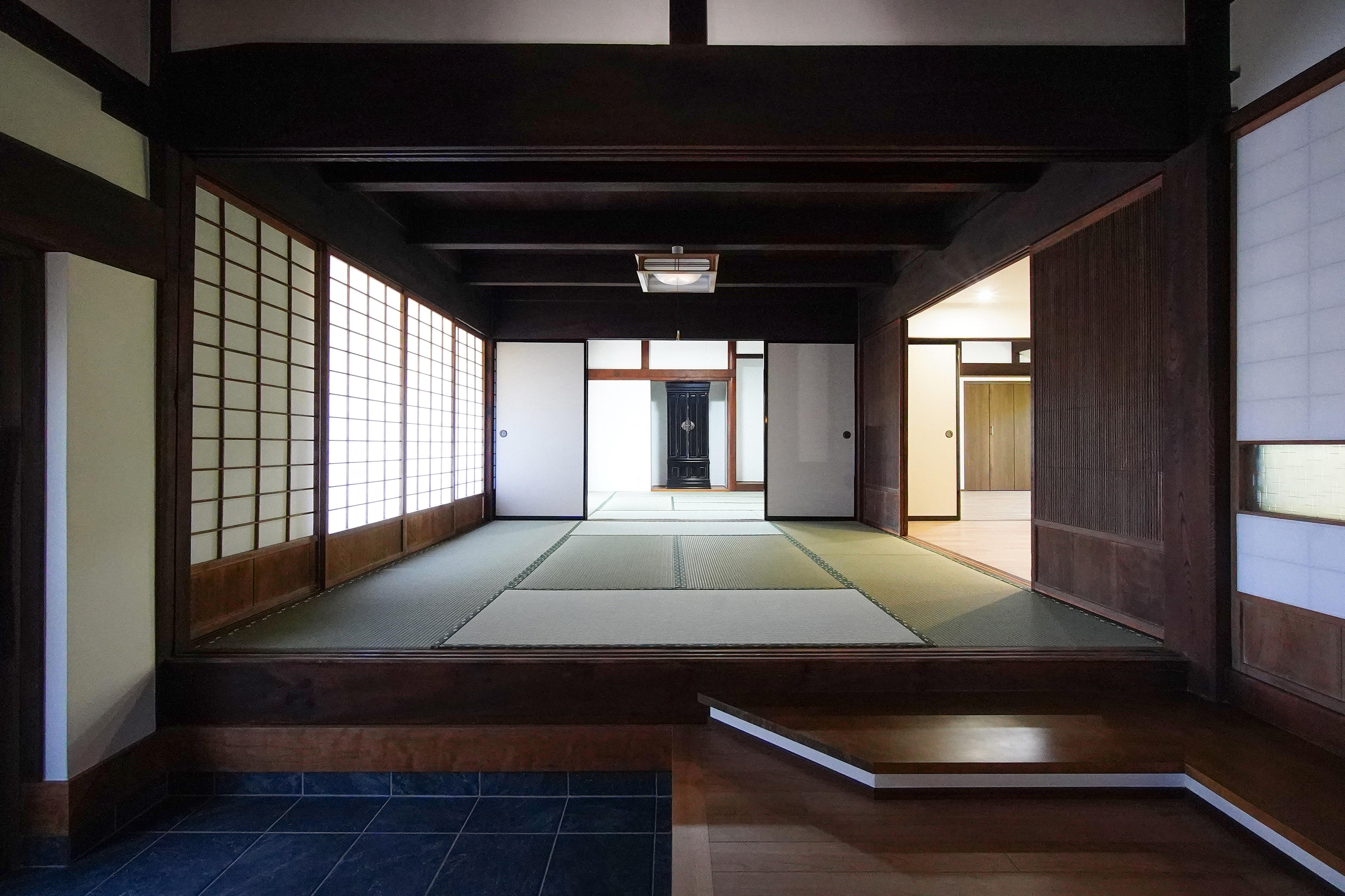 K様邸の古民家フルリノベーションが完成しました。築年数○○年の古民家のしっとりとした和の雰囲気を大切にしながら改修工事を行いました。来客時コミュニケーションがとりやすいようにと玄関土間から仕切りなく続く広い和室は、現代の住宅ではなかなかお目にかかれない、昔ながらの風情を残しています。