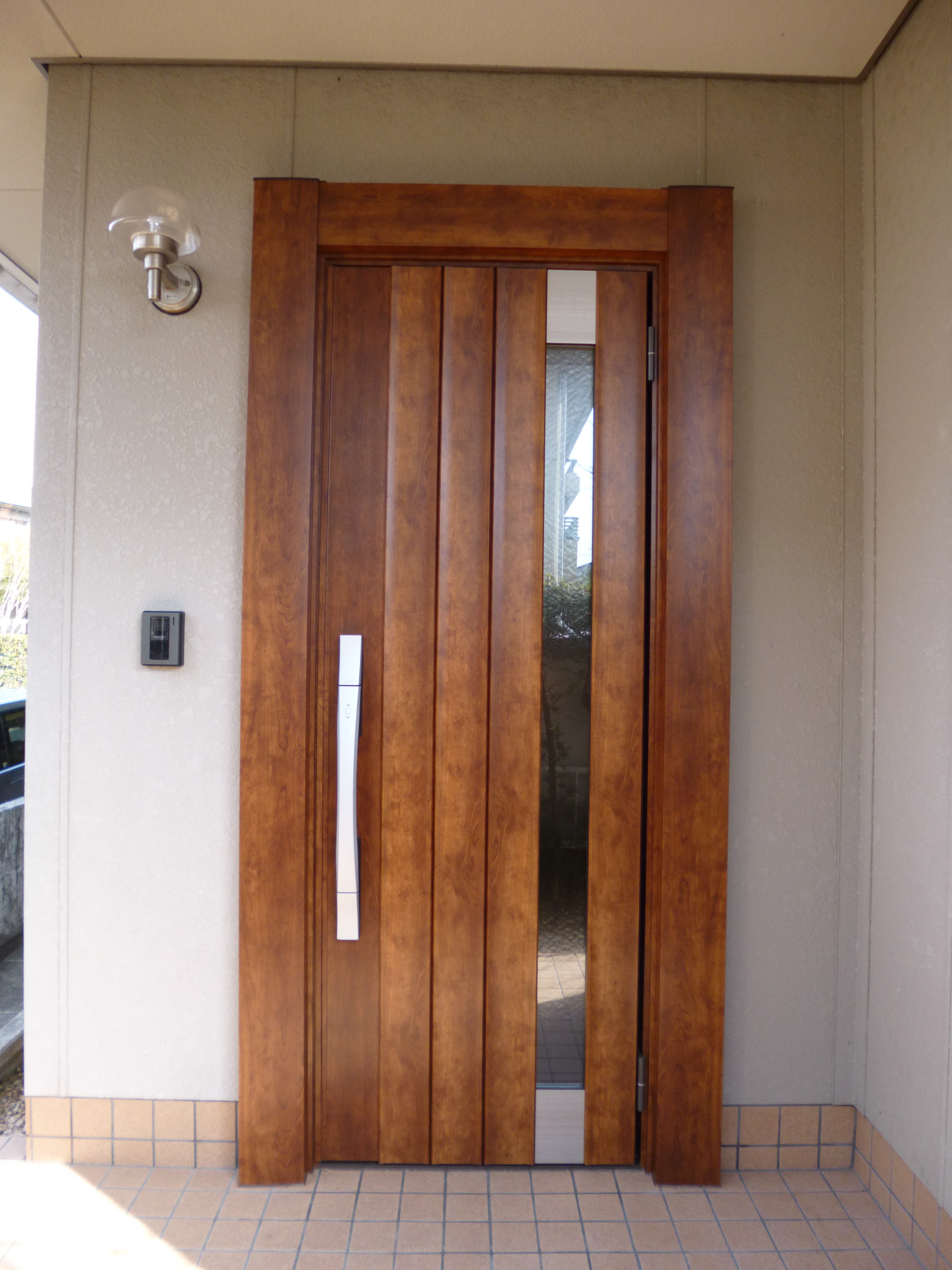外観デザインと防犯面にお悩みのあったお客様。木彫のデザインで見た目も一新し、タッチキーで防犯面もしっかり!