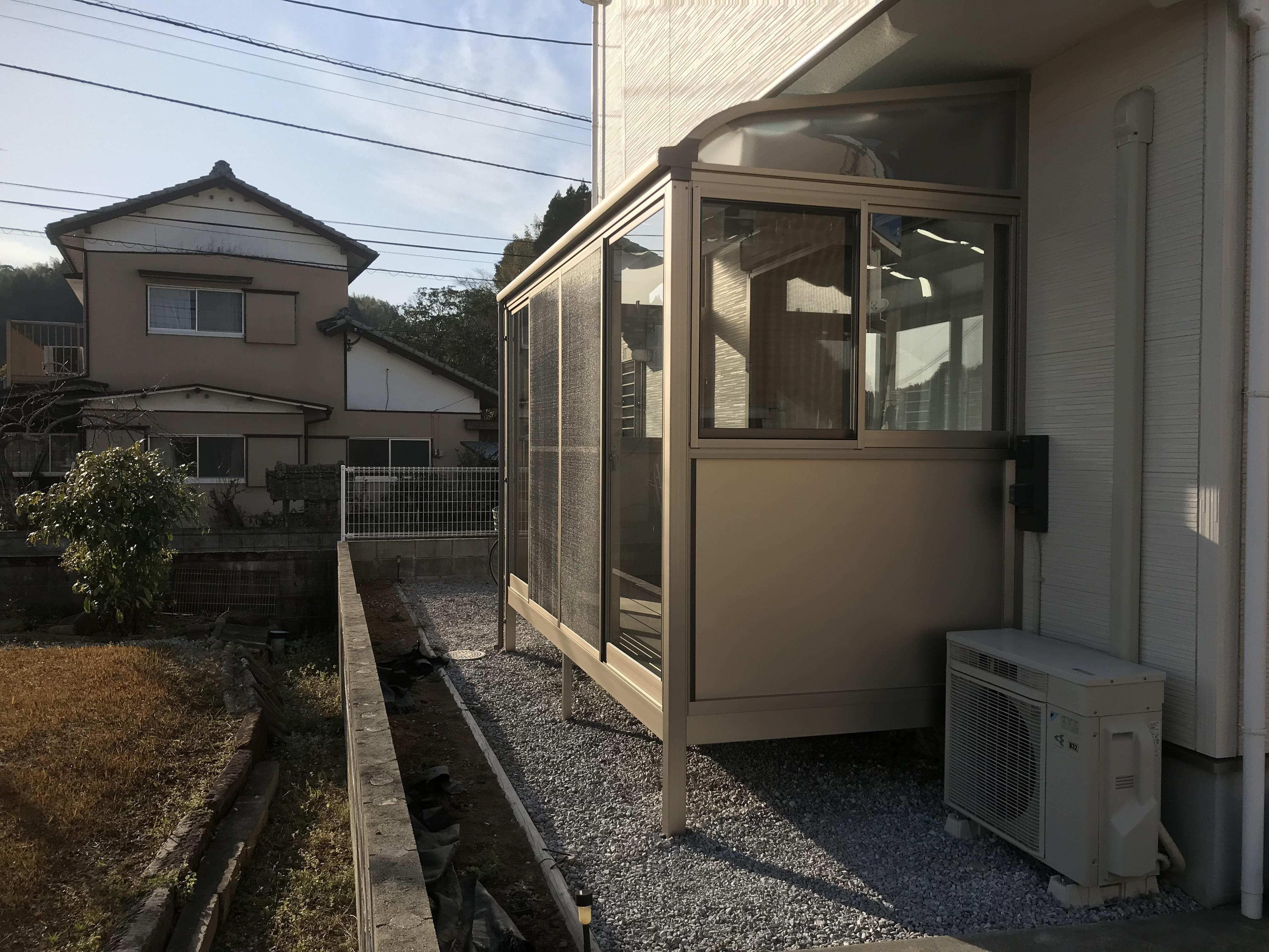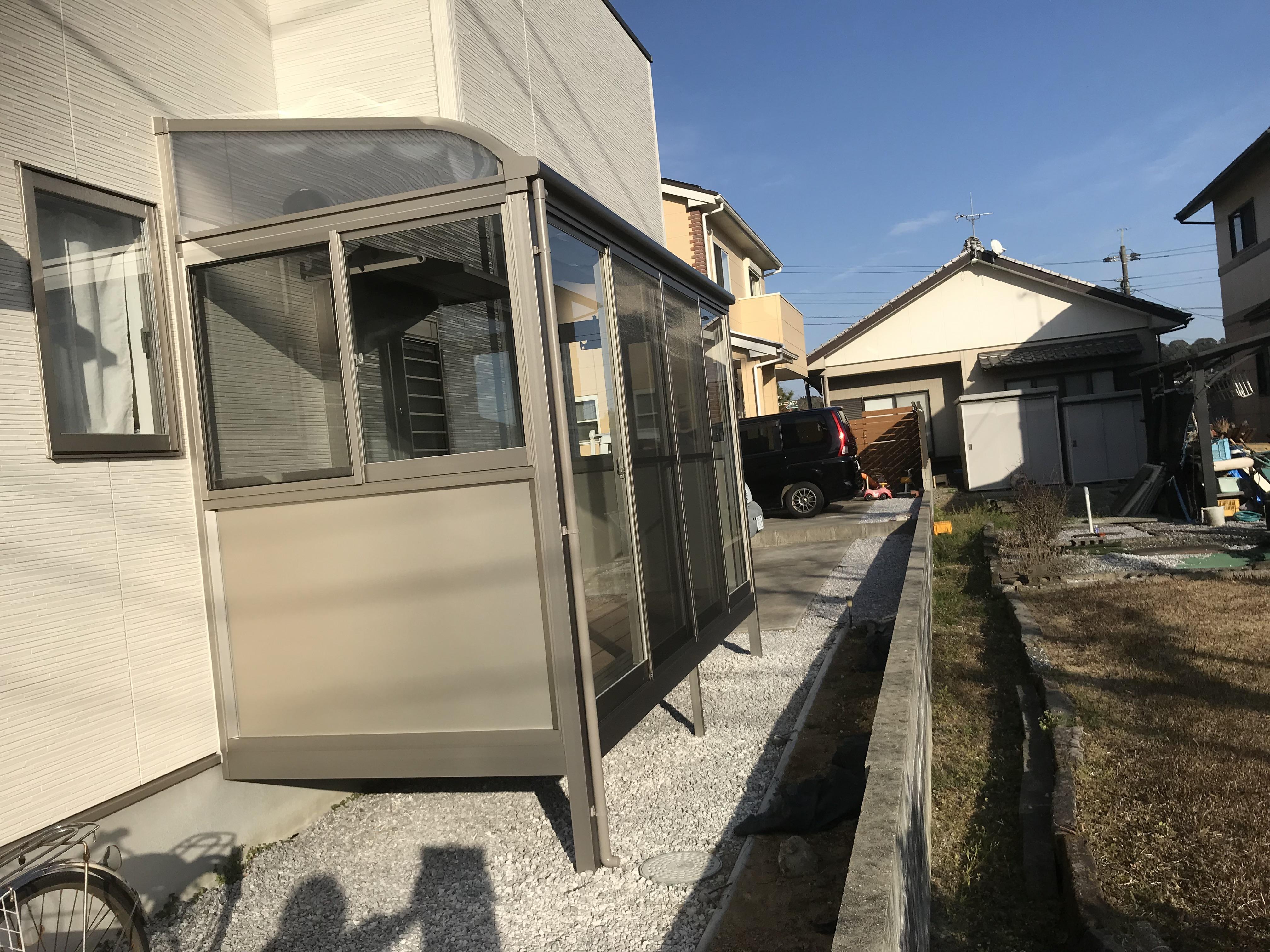 テラス囲い(サニージュR型):間口3640×奥行1485 シャイングレー色、屋根部:熱線吸収ポリカ+内部日除け、片側面のみ高窓(すべて網戸付)