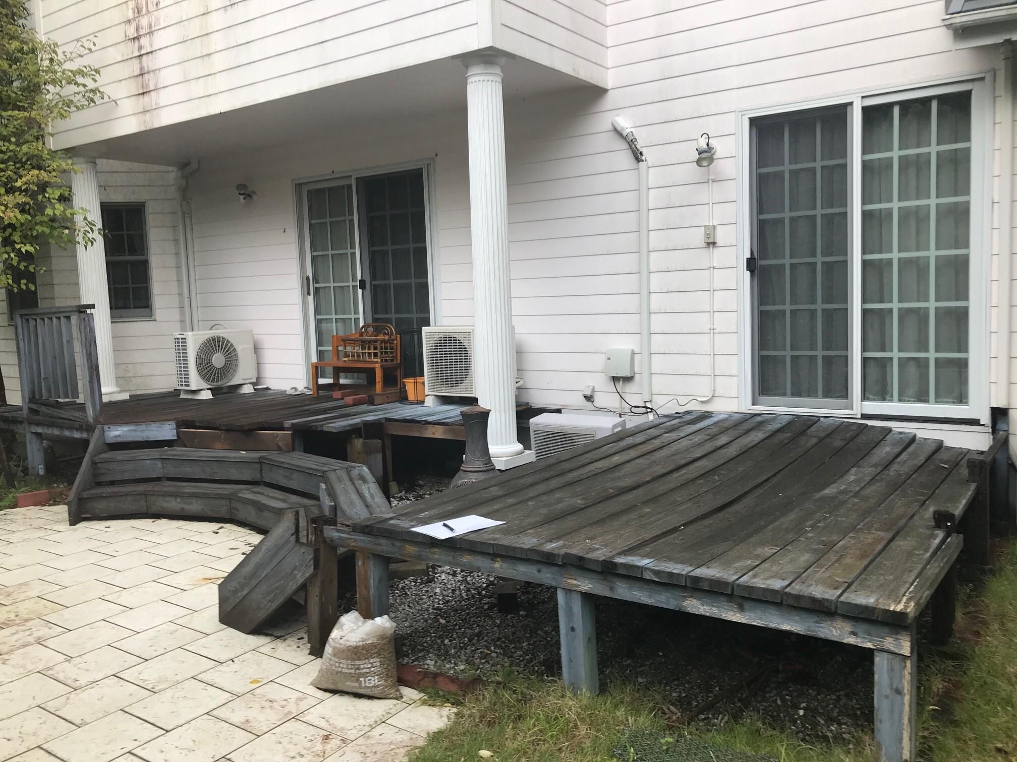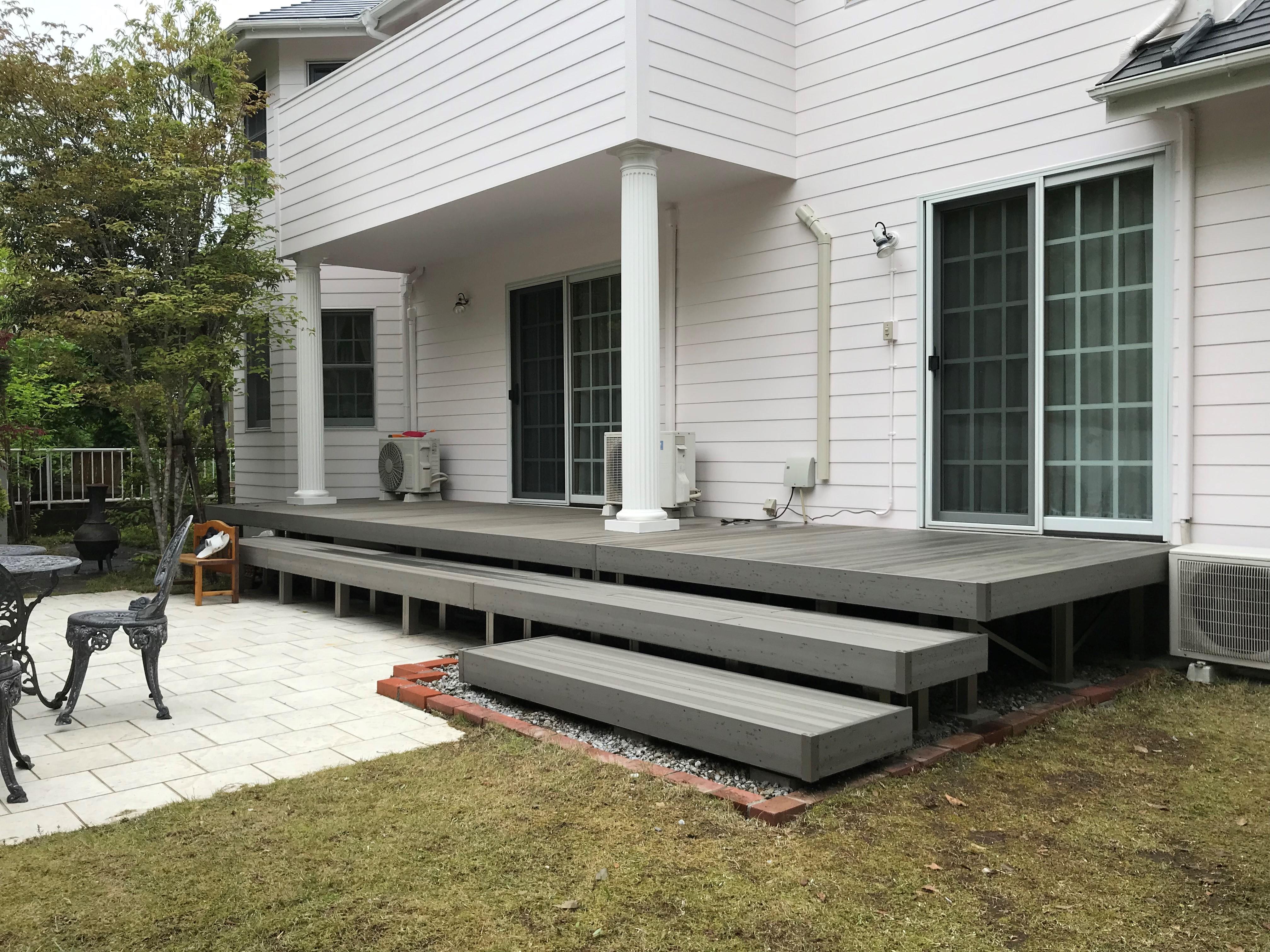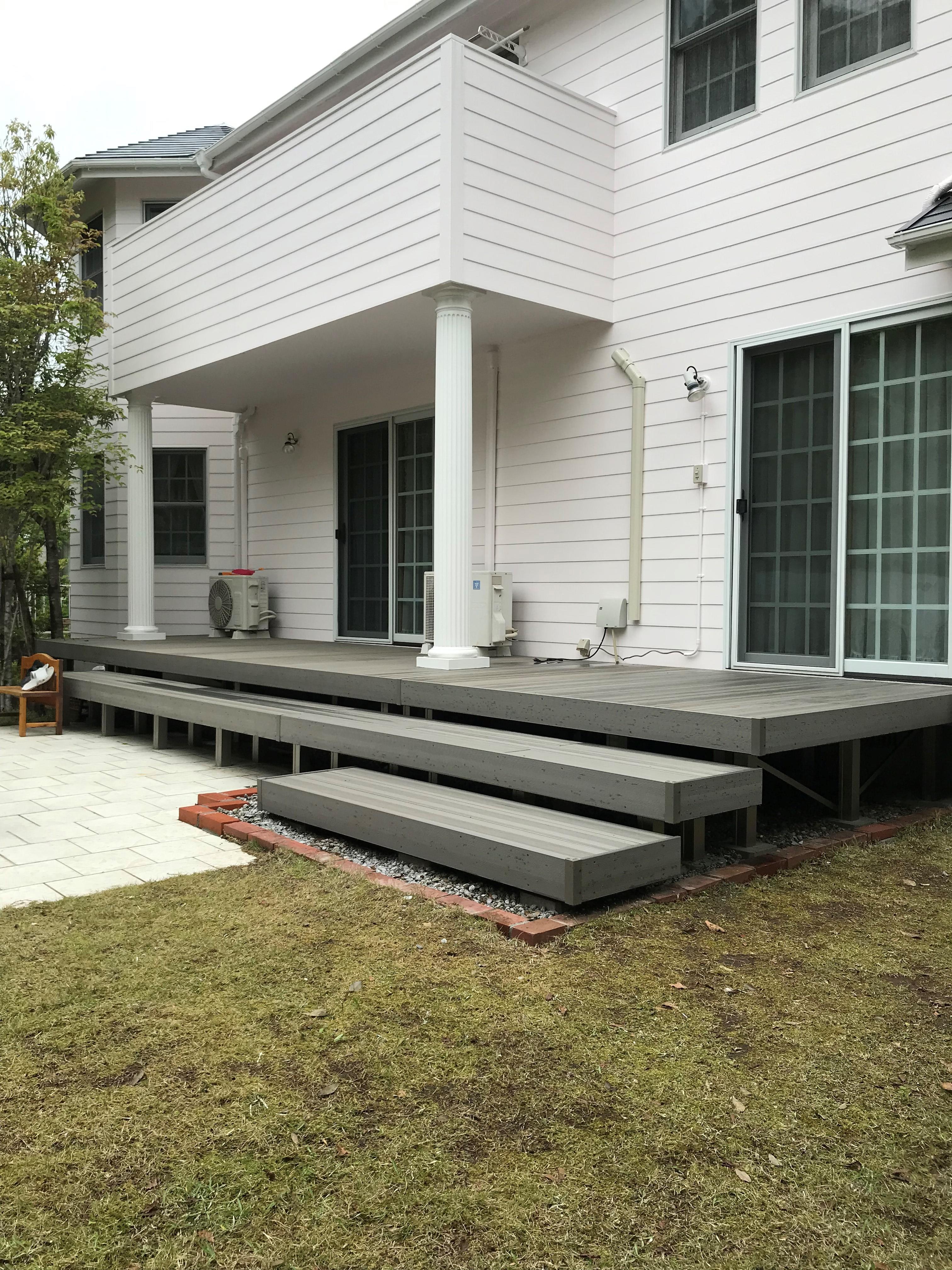 既存デッキ腐食のためご相談がありリフォームに至りました。仕様:樹ら楽ステージ(木彫)色:シルバーグレー