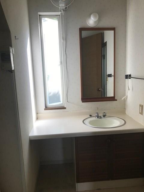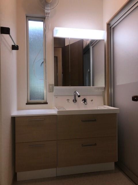 浴室・洗面室・屋外手洗い場リフォーム工事(バスルーム:アライズ,洗面化粧台:ピアラ3面鏡仕様,手洗い場:2口水栓柱、高さ約1.2M)