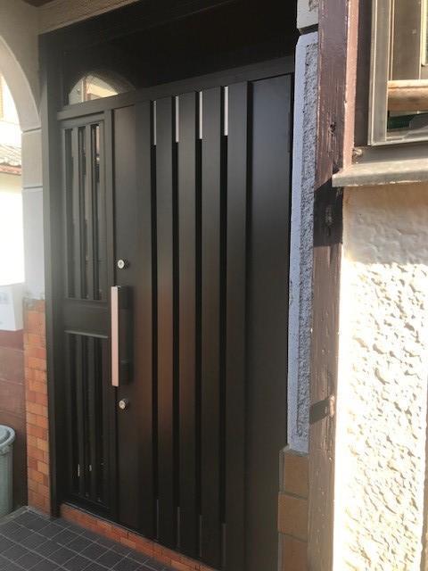 リシェント玄関ドア3:断熱仕様k4ランマ付 引き戸からドアへ取替えしたいとのご要望。 開閉がスムーズになり大変喜ばれていました。
