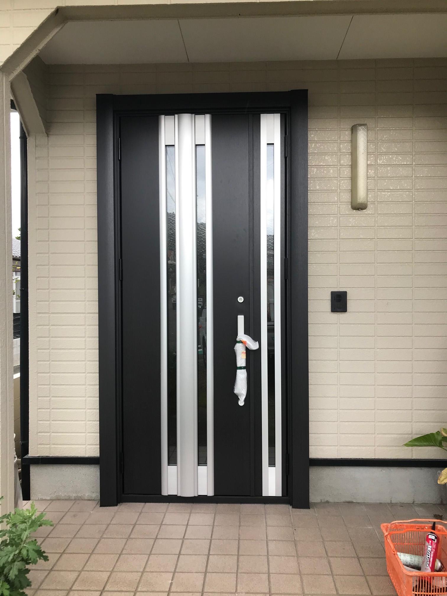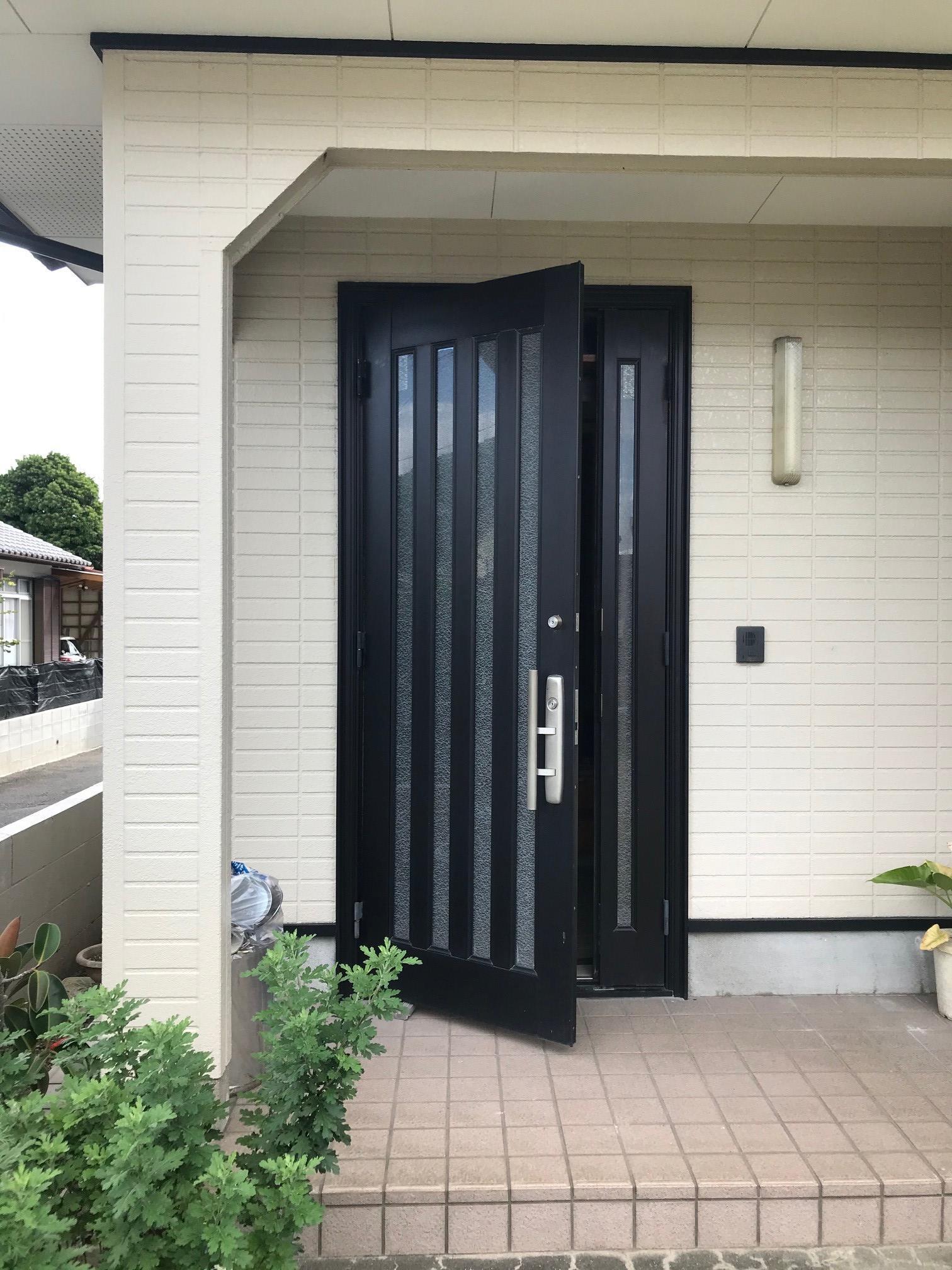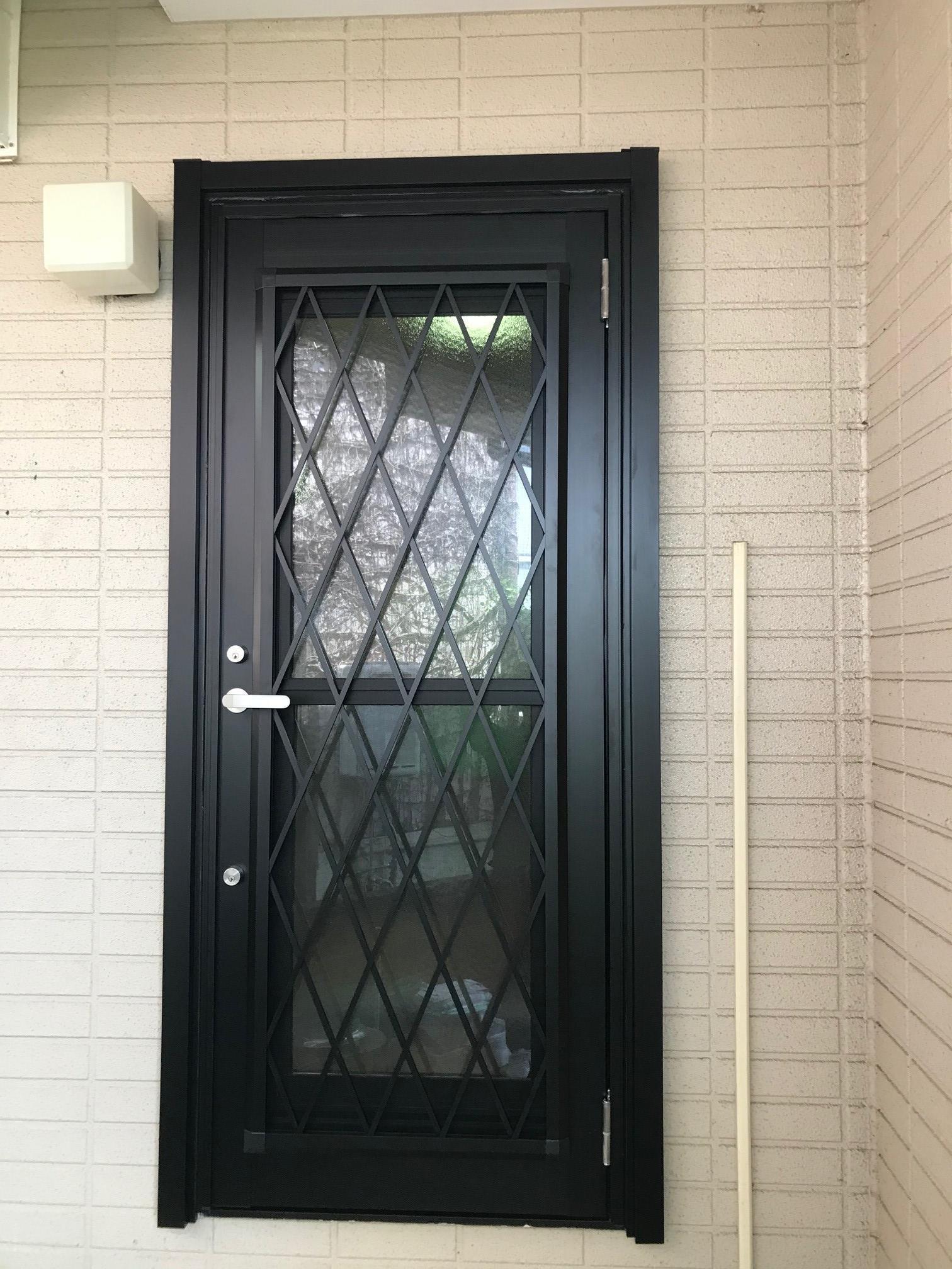 玄関リシェント:断熱仕様K4(G77型) 勝手口:網付格子C型ヒシクロス アルミ面格子・目隠し可動ルーバー取付工事