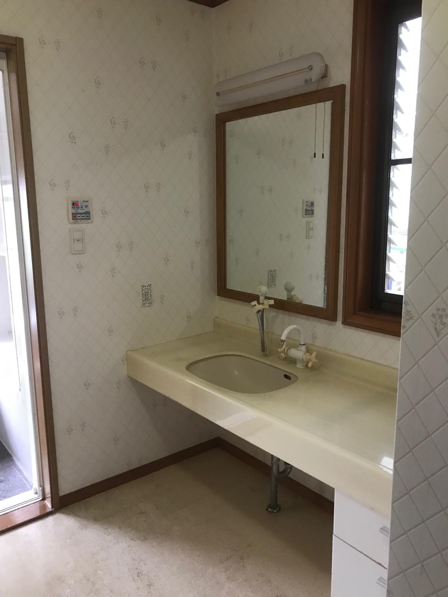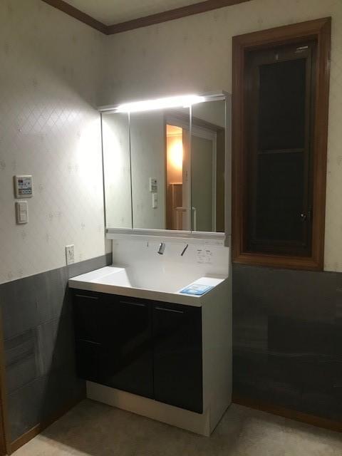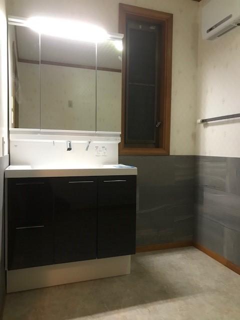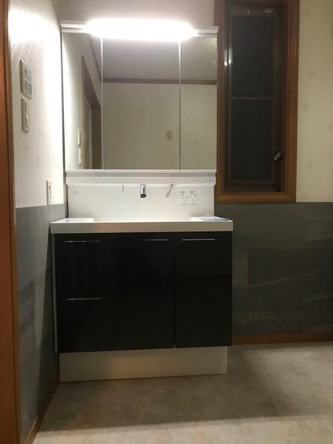 洗面脱衣室リフォーム工事 洗面化粧台:LC18(扉カームウッドダーク色、即湯タッチレス水栓) 床CF工事 一部壁エコカラット施工