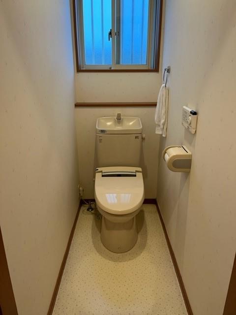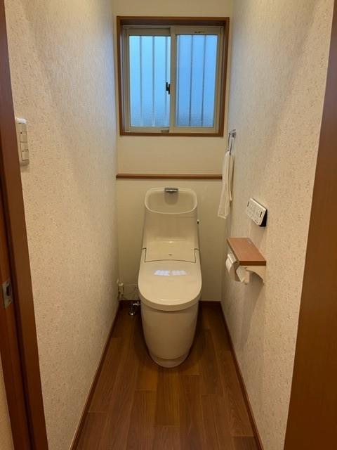 トイレリフォーム:プレアスHSタイプ(棚付2連巻紙器/タオルリング設置) 床CF張替工事・壁クロス張り工事