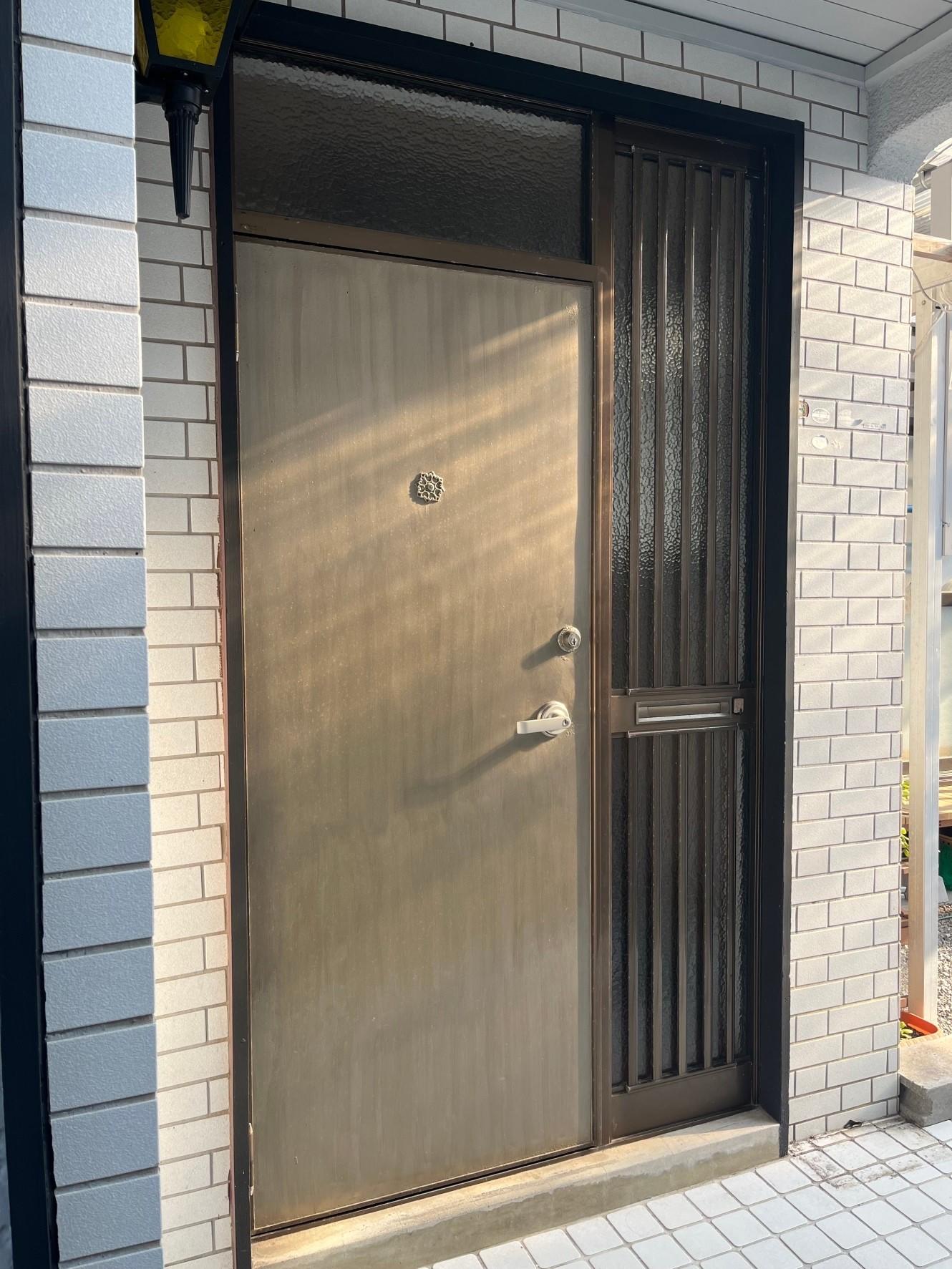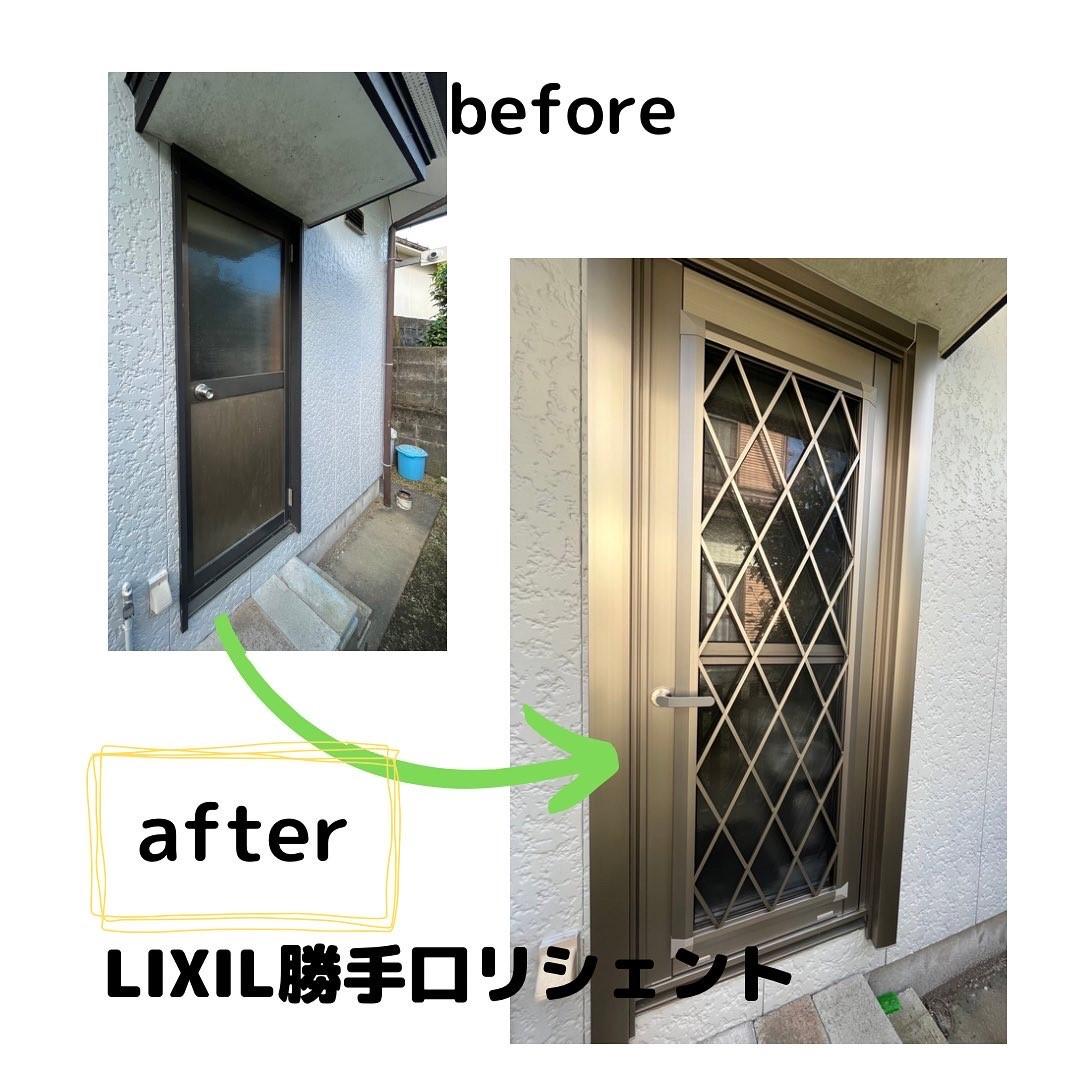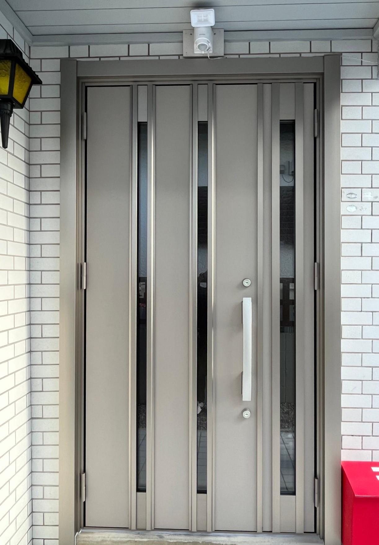 老朽化のため玄関及び勝手口のリフォームのご相談がありました。 リシェント玄関ドア3:M24型(断熱仕様k4親子ドア)シャイングレー色 リシェント勝手口ドア:K型断熱仕様(シャイングレー色)