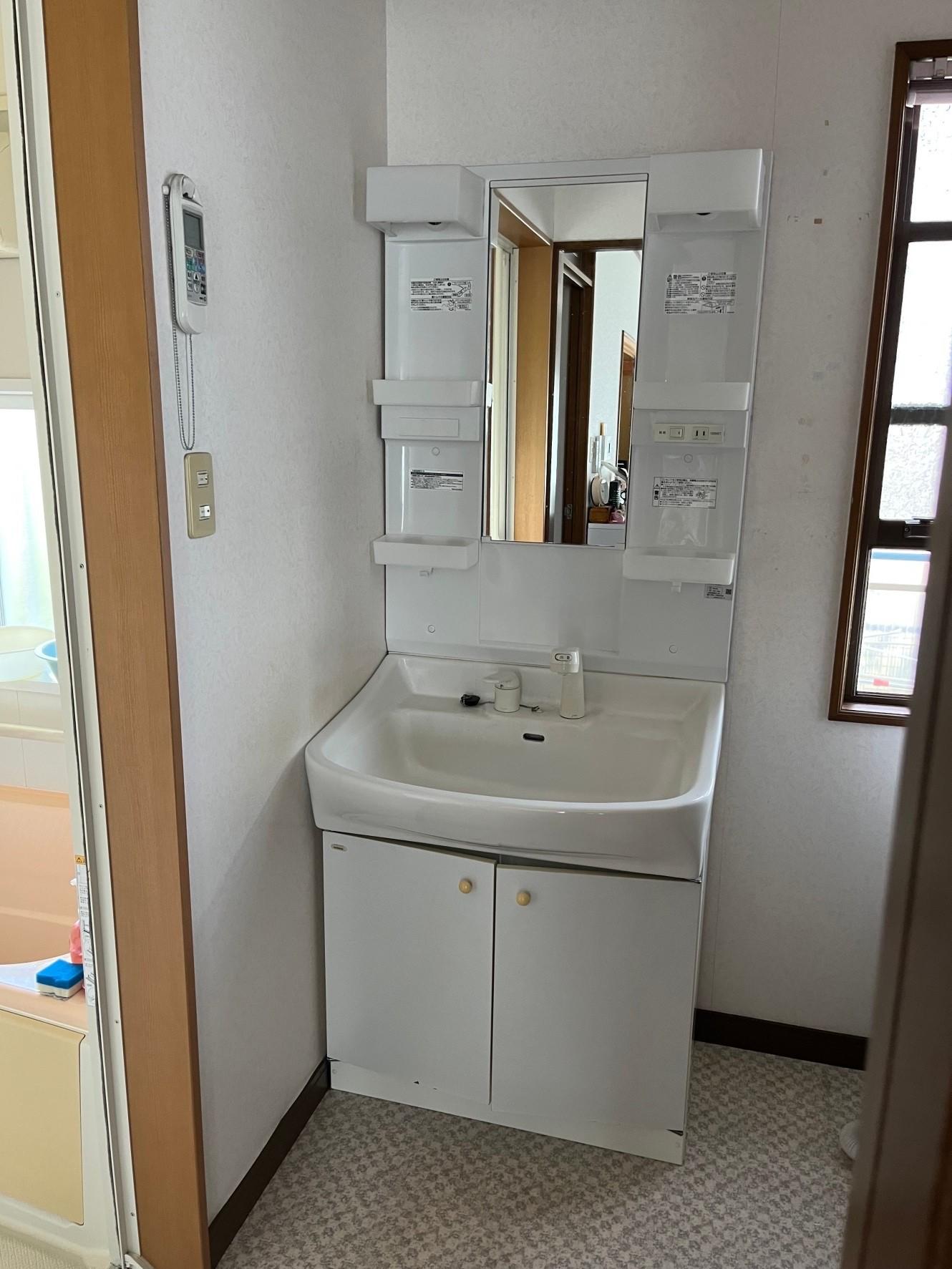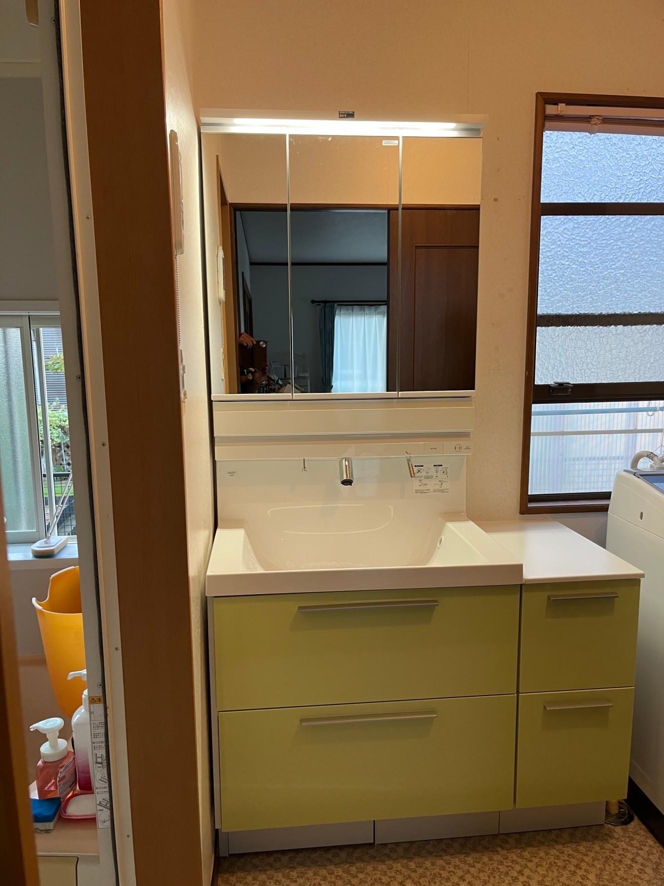 洗面化粧台取替工事 L.C.(3面鏡全収納)即湯タッチレス水栓(ナビッシュ)扉:ミントグリーン
