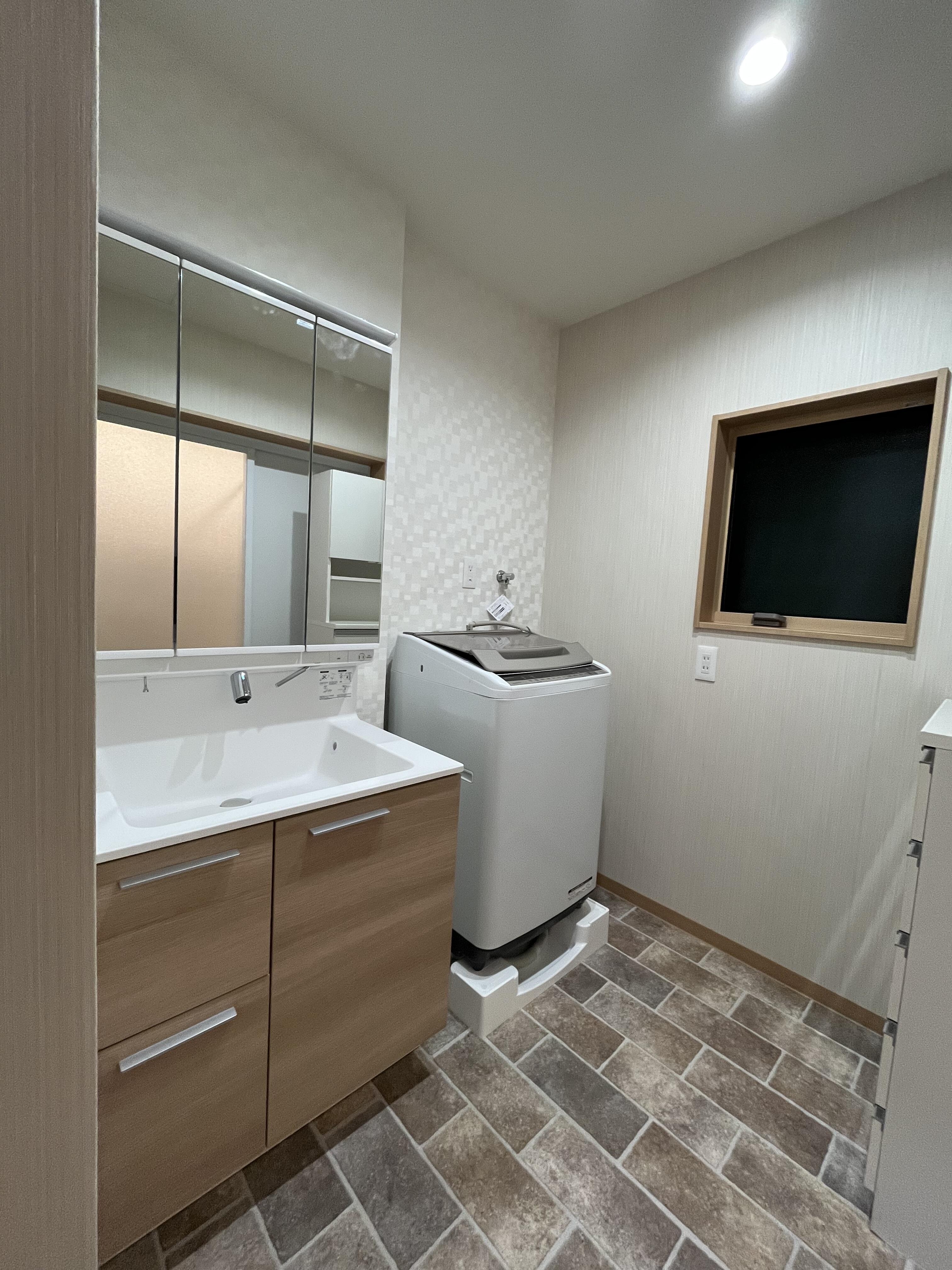 LIXIL洗面化粧台:クレヴィ(W750/奥行560 3面鏡) 床:フロアタイル仕上げ 内装クロス仕上げ(壁・天井) 外窓交換
