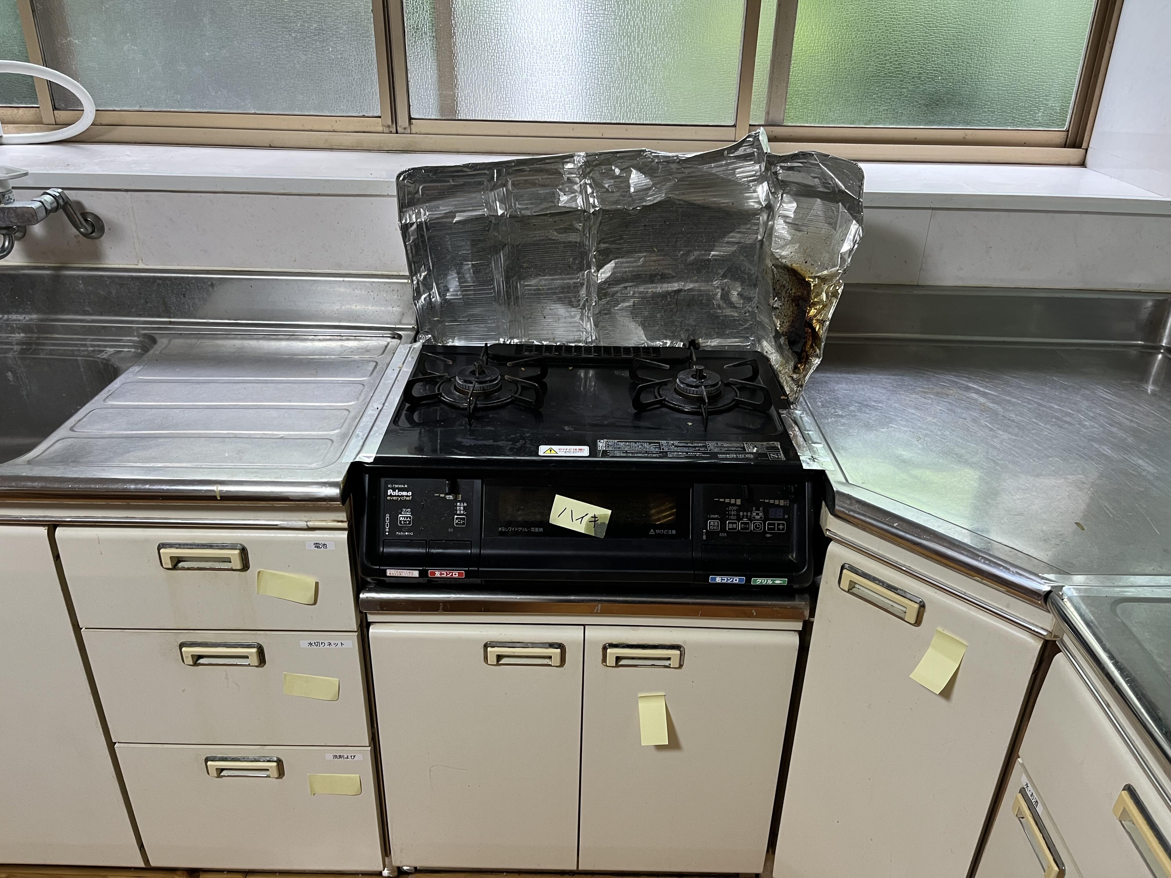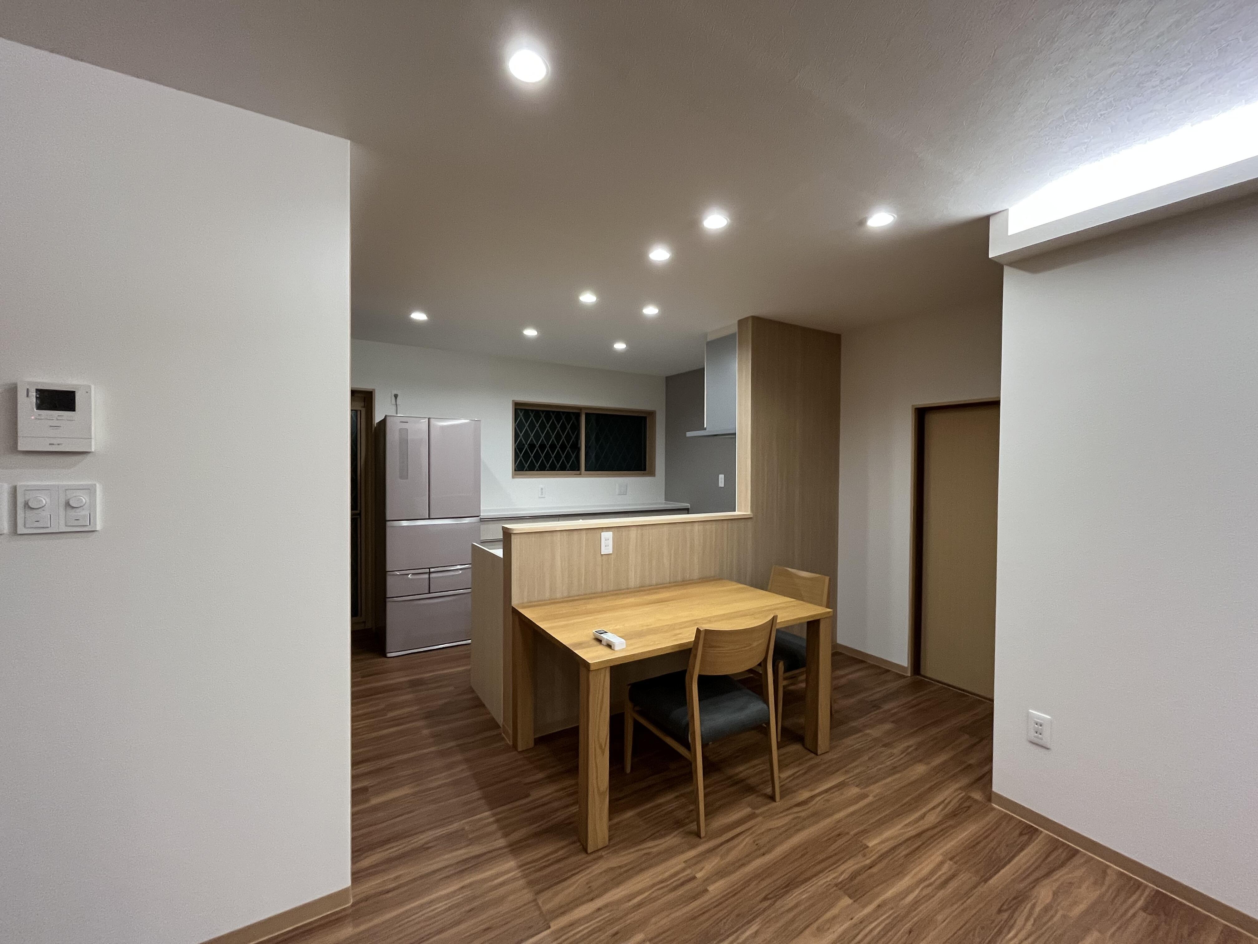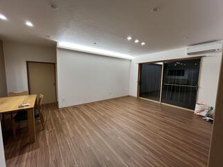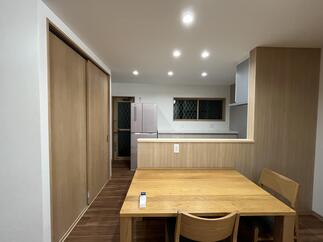 LIXILシステムキッチン:シエラ/センター型(背面収納セット) LDK工事 床:フロアタイル 内装:クロス仕上げ(壁・天井) 外窓交換(キッチン・リビング) LDK入口:LIXILラシッサS/引き違い戸