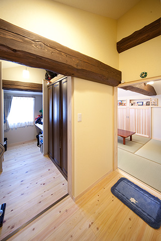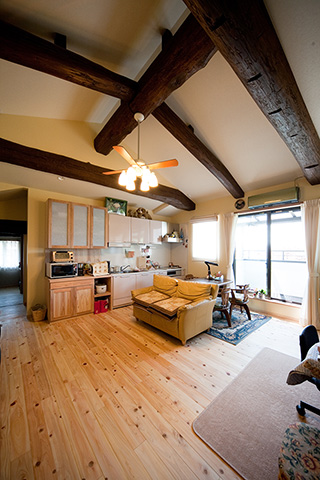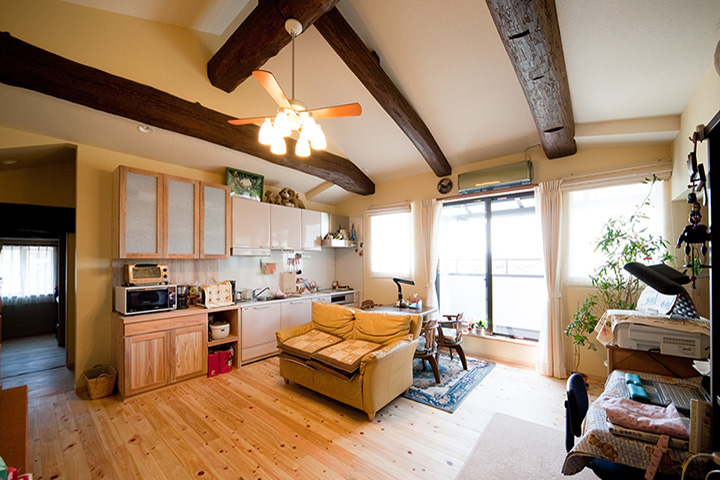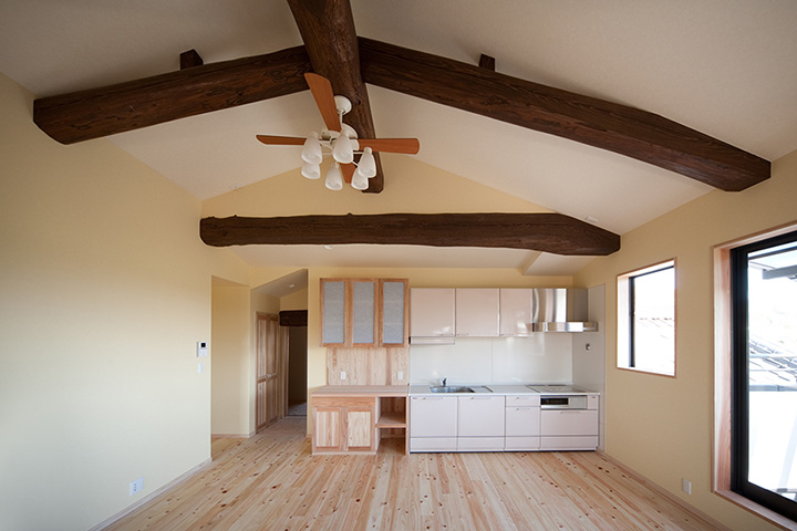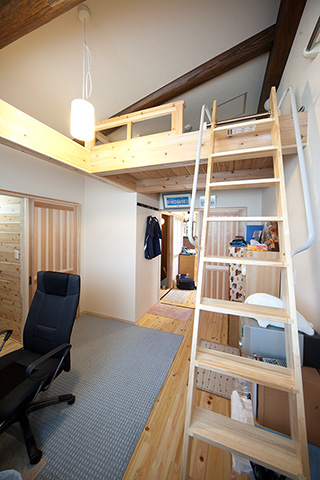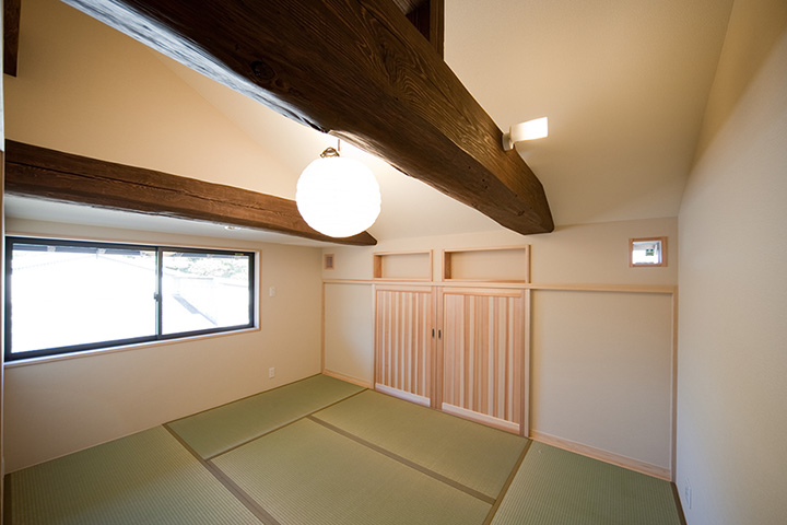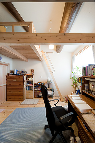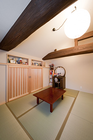 ご両親との同居を始める際に検討しておきたいことは「生活習慣の違い」です。別々に暮らしていたご家族にはそれぞれの生活習慣があり、無理にあわせようとすると、お互いに気疲れしてしまいます。 ご両親も息子さん家族も快適に過ごしていただけるよう、今回は思い切って浴室以外の水廻りをすべて2階に設置しました。とはいえ、改装できるスペースは限られており、空間を無駄なく生かすため、天井をすべて取り払い高さを出し、子供室にはロフトを設けました。 屋根の勾配で天井高が取れない場所は和室にし、イグサの香りが漂う落ち着ける空間をつくりました。また、ベランダを新設し、南からの明るい光と風を取り入れました。